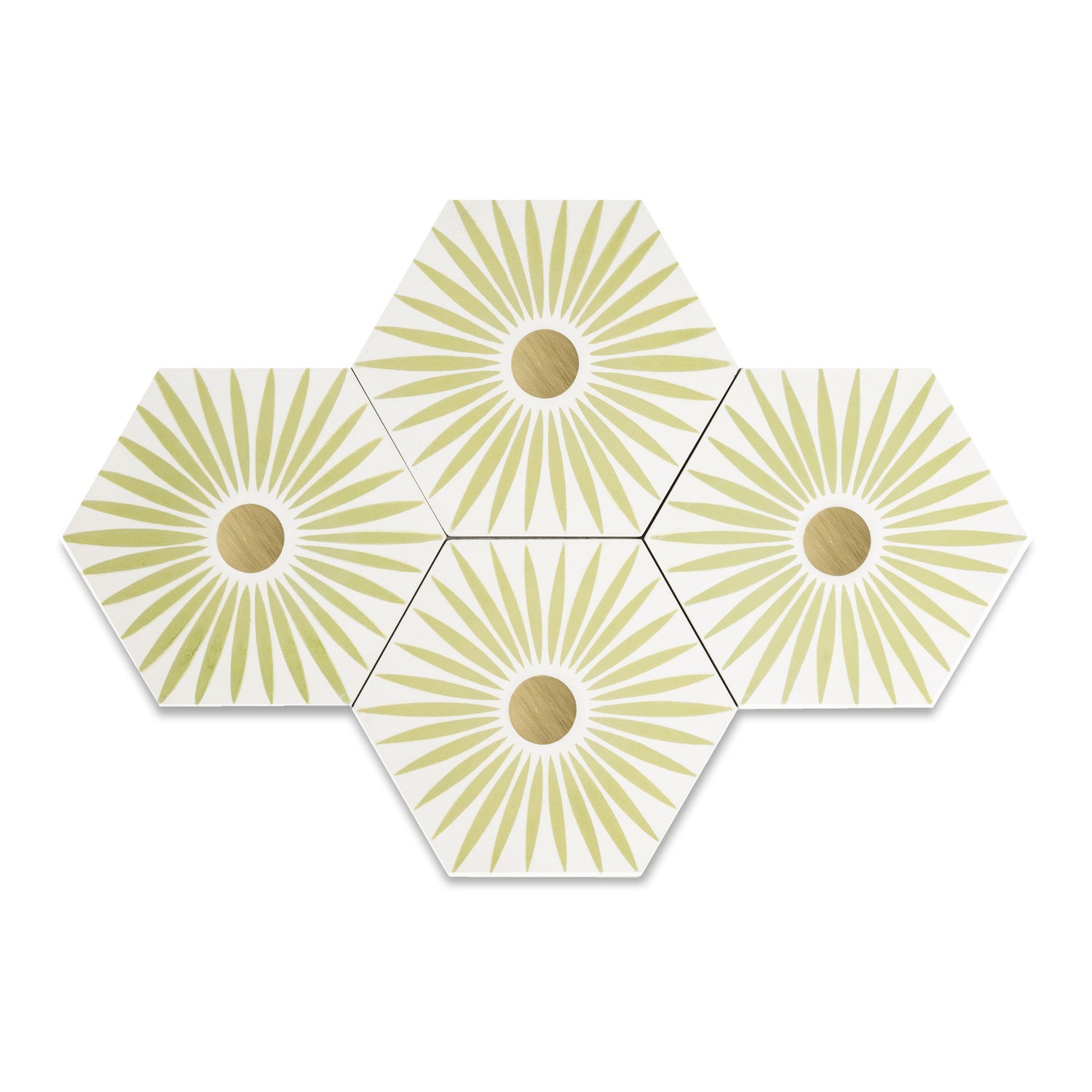 The Rise Hexagon Cement Tile brings a sunny disposition to your space with its bright starburst design. Handcrafted from premium cement and available in 7 variations, including metallic versions made from brass, aluminum, and copper, this tile is perfect for brightening backsplashes or redefining bathrooms. The 6” x 7” Rise Tile delivers both vibrant beauty and durable craftsmanship, making it a standout choice for any room.