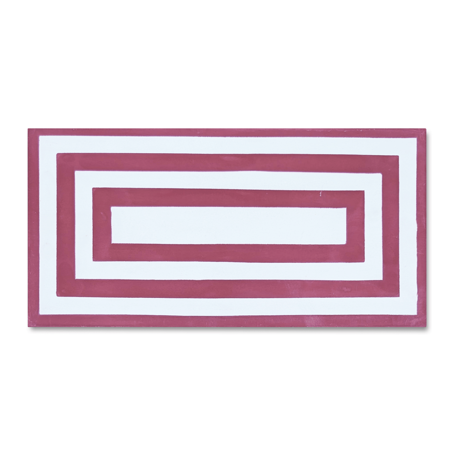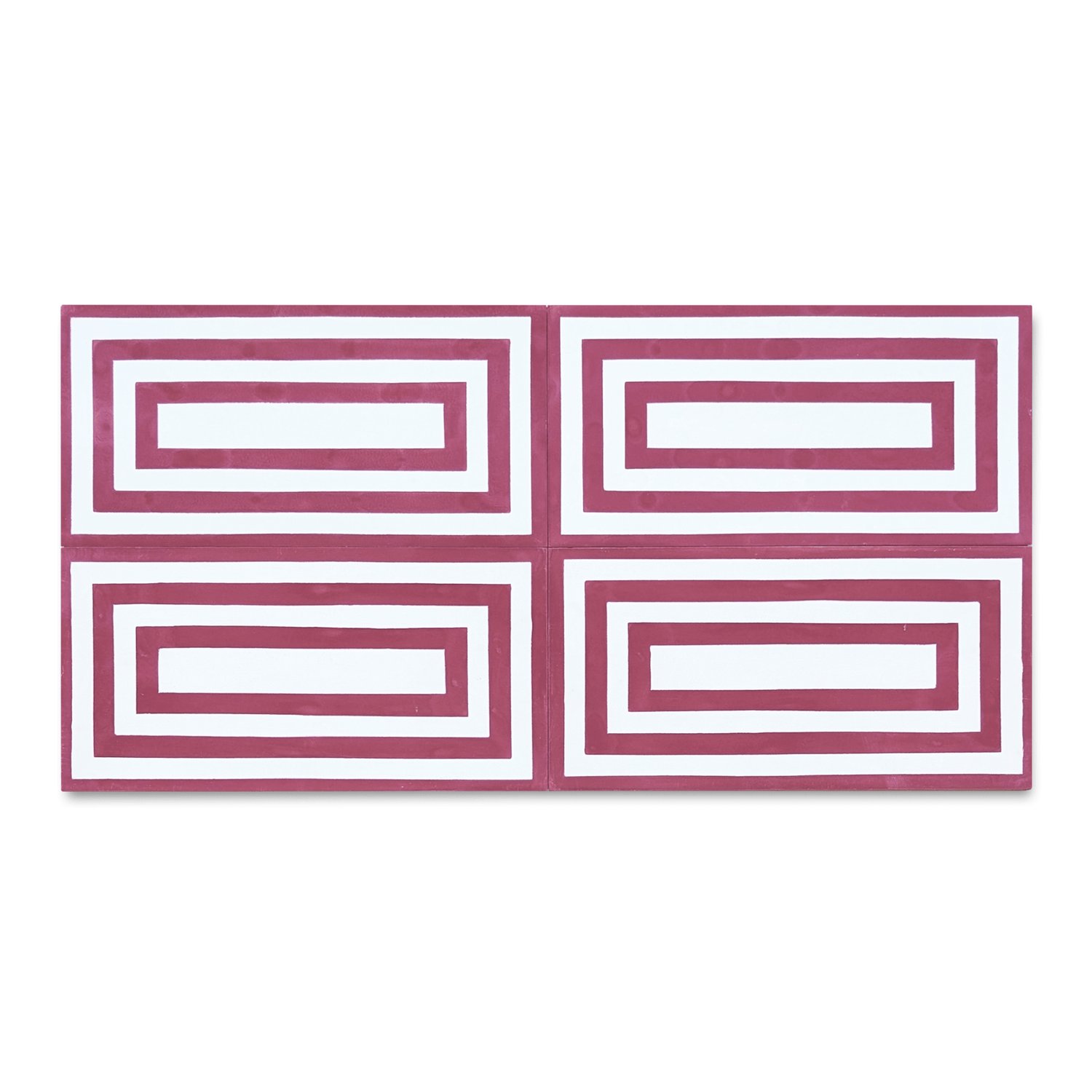 Frame tiles are premium cement tiles that explore balance through repetition, with parallel lines forming a frame-within-a-frame composition that creates a clean, architectural rhythm across the surface. Each variation shifts the atmosphere through color: Frames 4 pairs rich burgundy with soft white for sharp clarity, Frames 5 blends sky blue, leafy green, and terracotta orange in a playful, refreshing palette, Frames 6 deepens the same blue and green tones around terracotta for a more grounded, organic harmony, while Frames 7 sharpens the rhythm with bold cobalt blue, crisp white, and black for a striking, modern edge. Together, the series demonstrates how geometry stays constant while color transforms the mood.