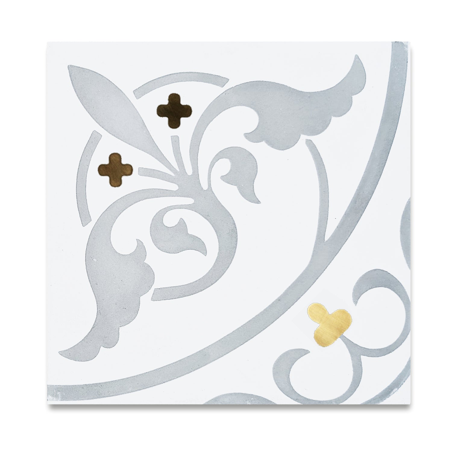 Exuding timeless elegance, the Bijoux Cement Tile is crafted from premium cement and features a refined encaustic pattern with a touch of brass, adding a luxurious shimmer to any room. Traditional yet charming, this 8” x 8” tile is perfect for creating a unique, sophisticated space that combines elegance with a modern flair.