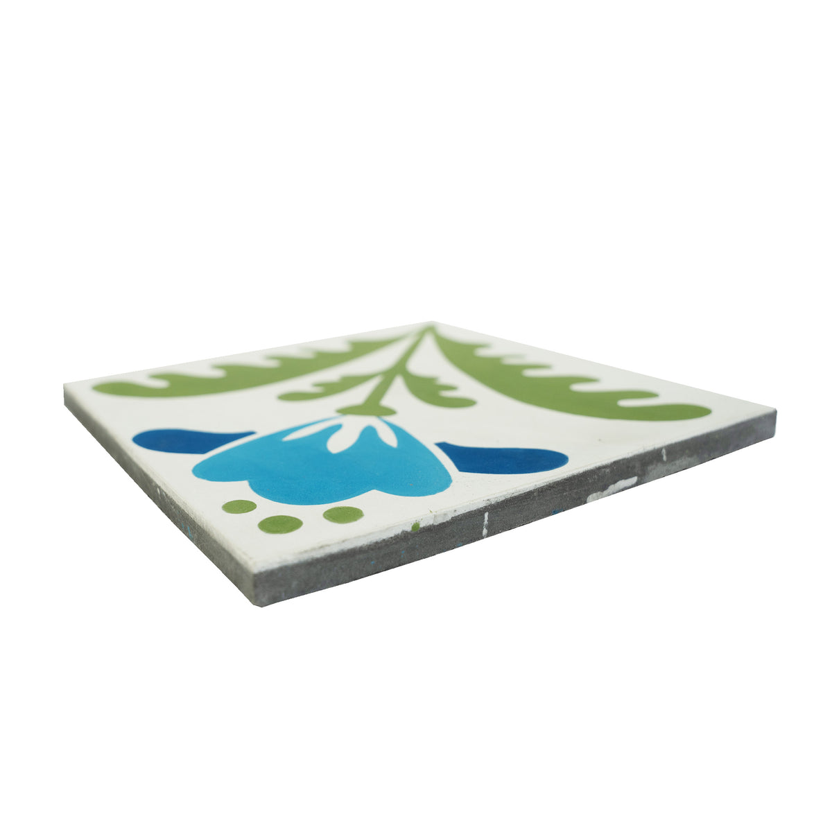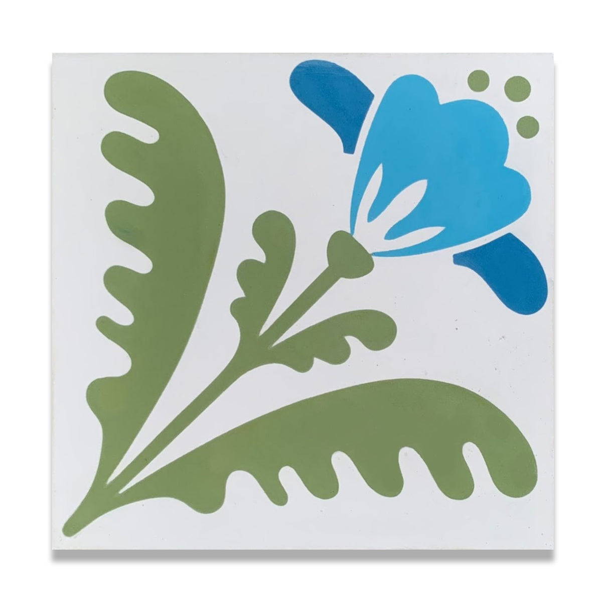 The Linda pattern features a charming floral design, evoking a sense of nature’s simplicity and grace. A bold blue flower, complemented by flowing green leaves, brings a fresh, lively energy to any space. The clean, minimalist backdrop enhances the vivid colors, making this 8” x 8” tile a perfect choice for both modern and traditional aesthetics. Designed by Hollis Callas.