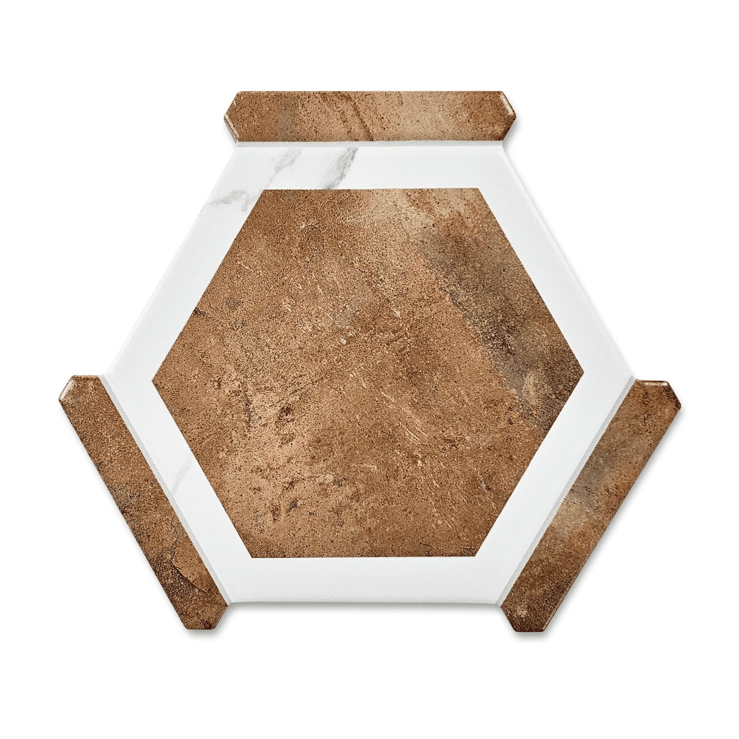 The Contour Collection redefines decorative tile with sculptural layouts and bold contrast built directly into the design. Each 9" x 10" porcelain tile in this hexagonal series is crafted to create the illusion of multi-piece inlays—without the complexity of assembling individual components. From clean monochrome borders to layered stone and wood combinations, our Contour tiles offer striking geometry with a single, easy-to-install surface.