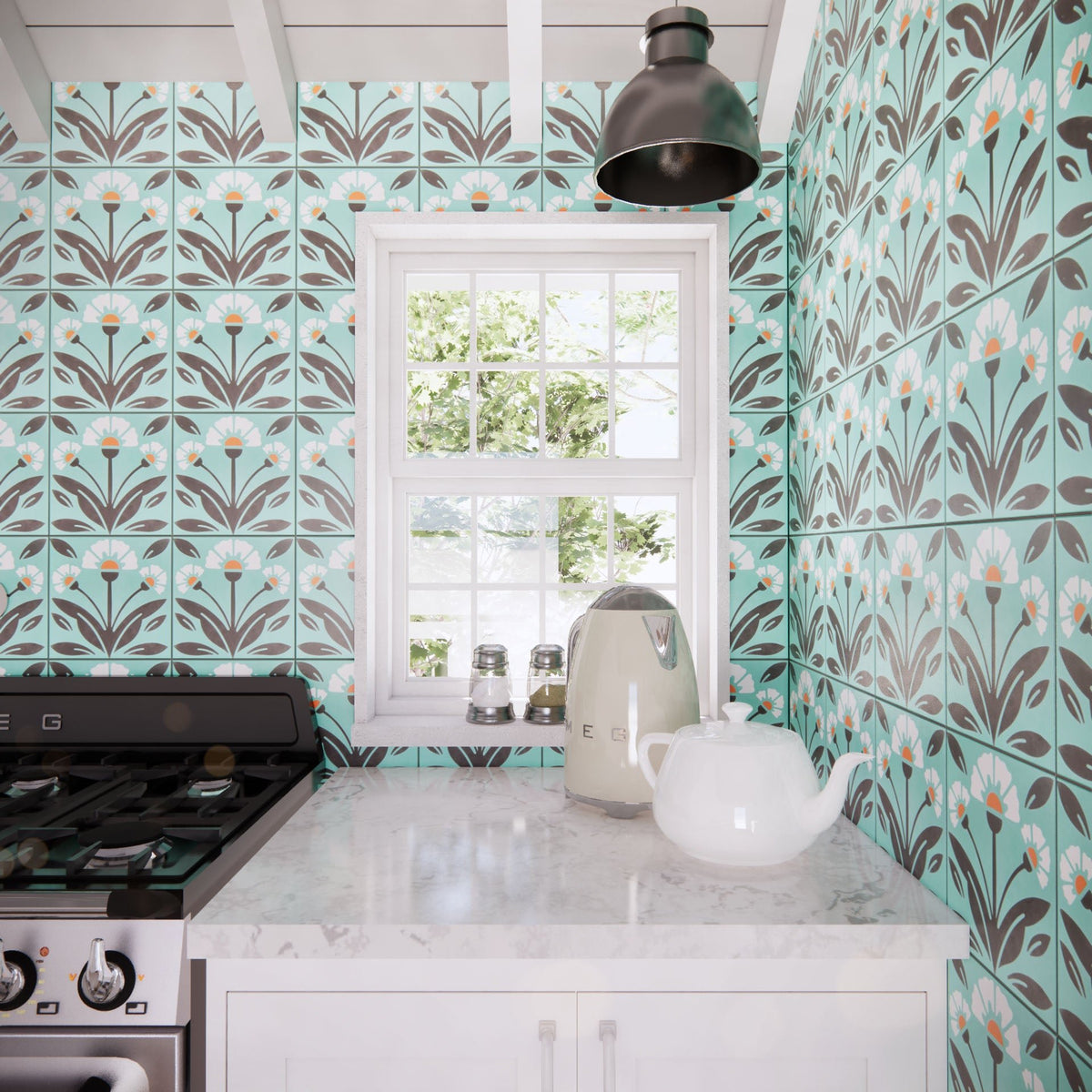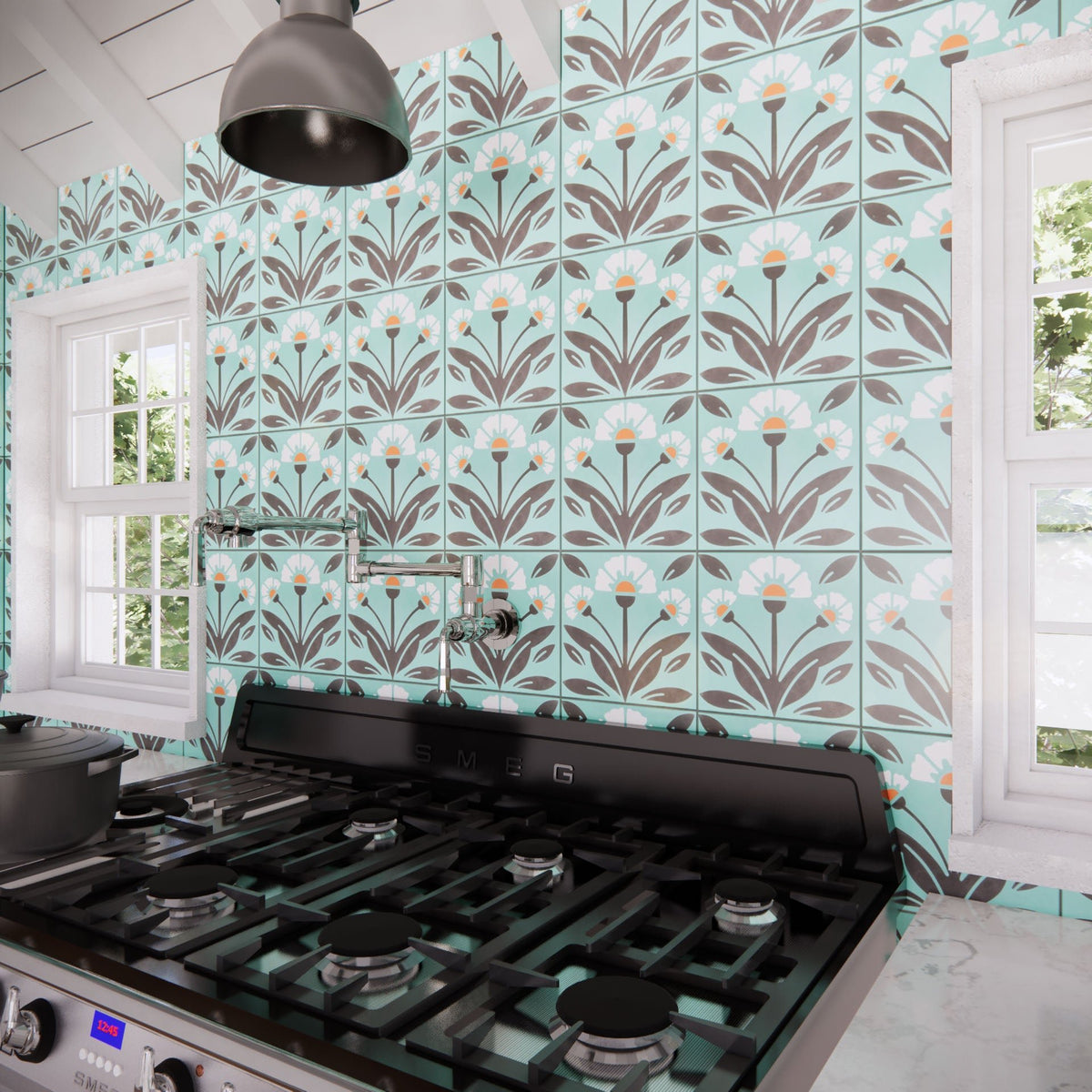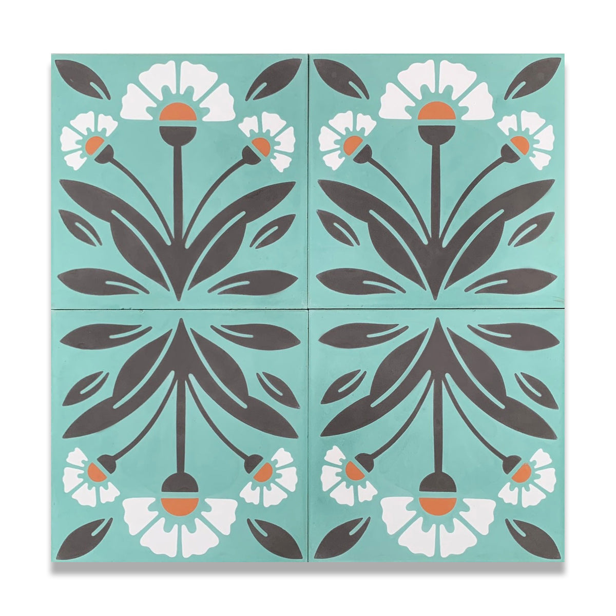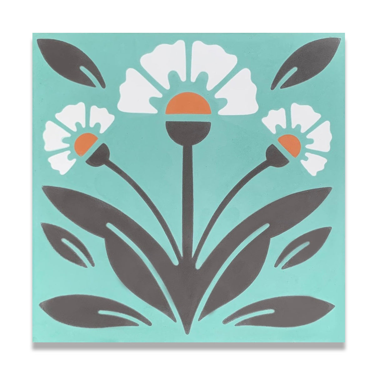 The 8” x 8” Camilla tile showcases a playful floral design with bright white blooms and orange centers set against a vibrant turquoise background. The dark green leaves add depth and contrast, making this tile a fresh and lively choice for any space. Designed by Hollis Callas.