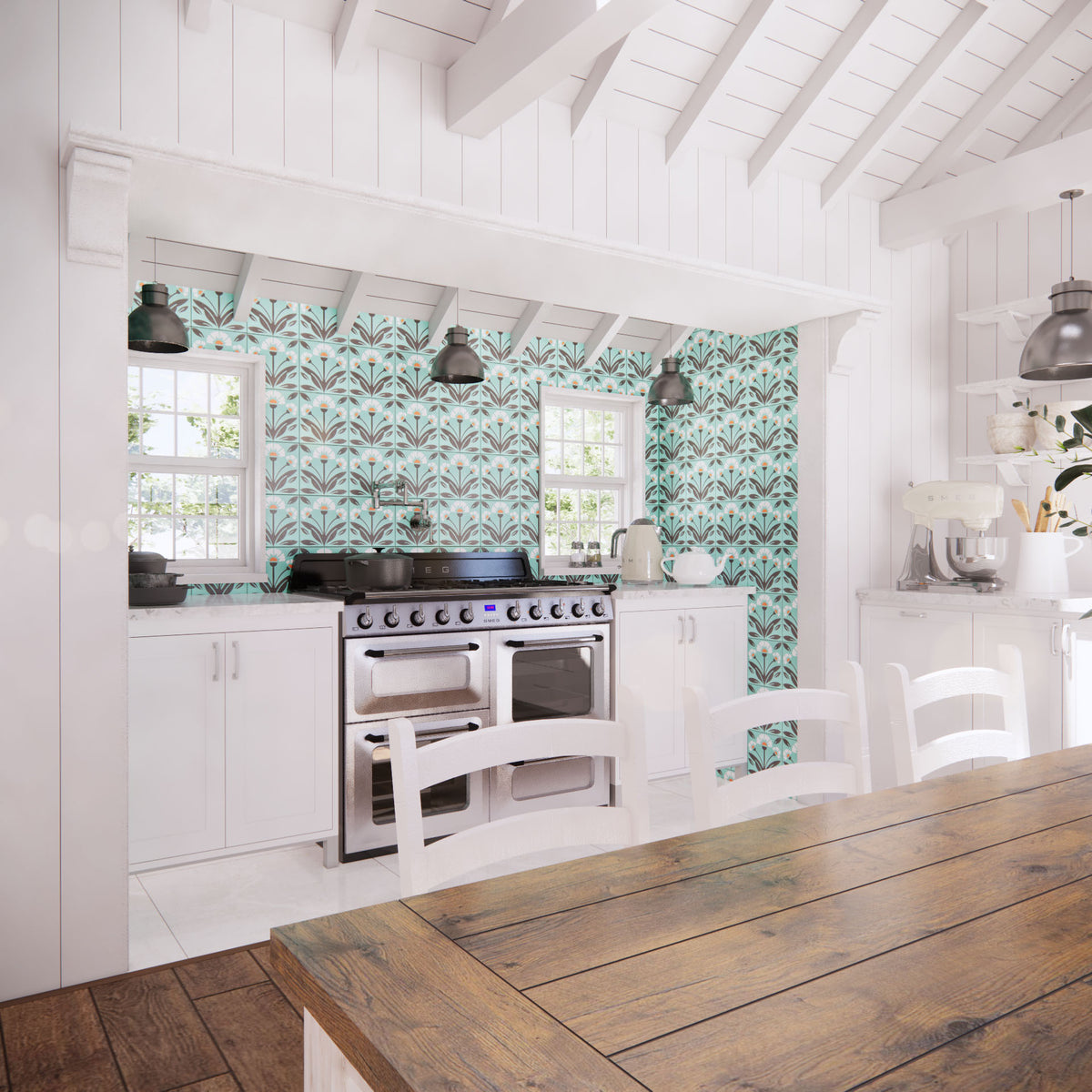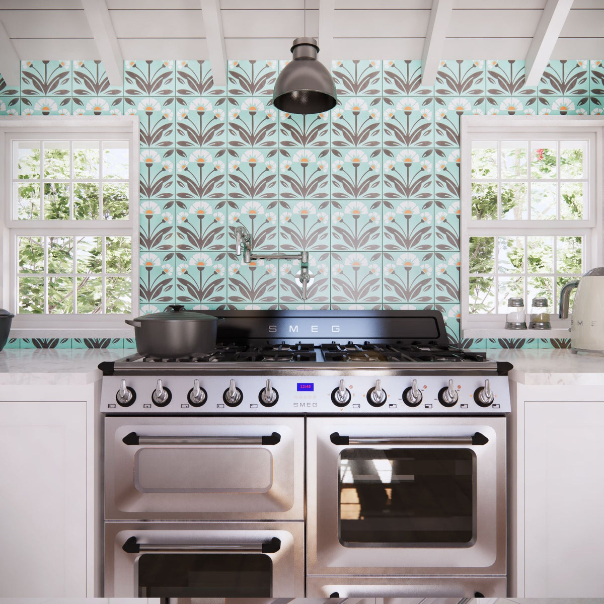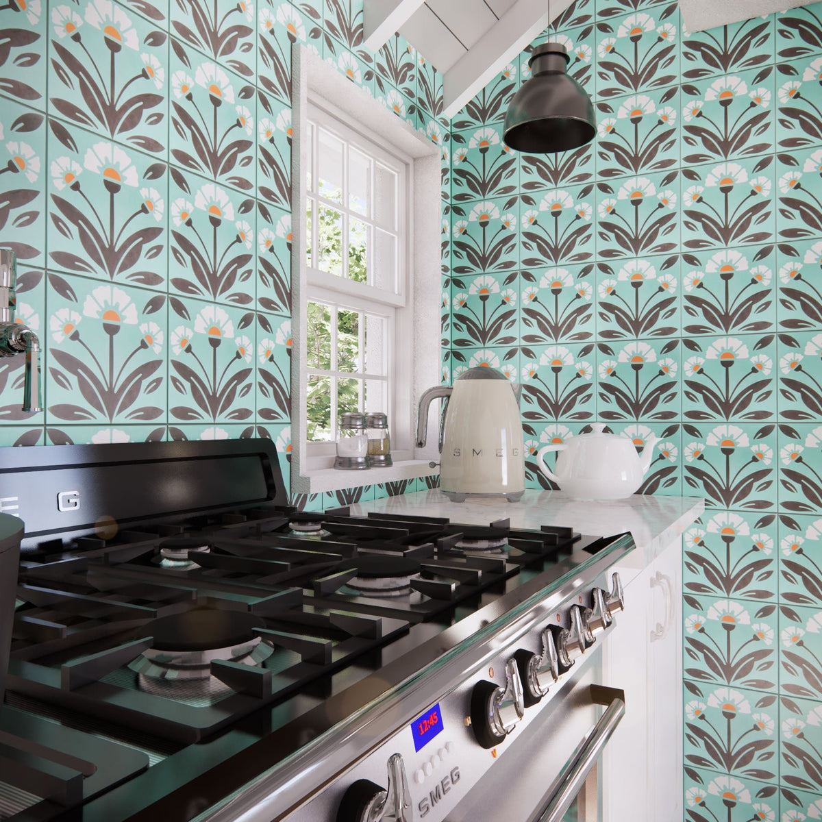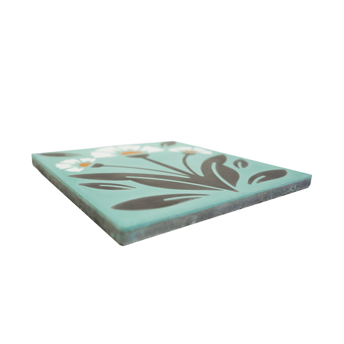 The 8” x 8” Camilla tile showcases a playful floral design with bright white blooms and orange centers set against a vibrant turquoise background. The dark green leaves add depth and contrast, making this tile a fresh and lively choice for any space. Designed by Hollis Callas.