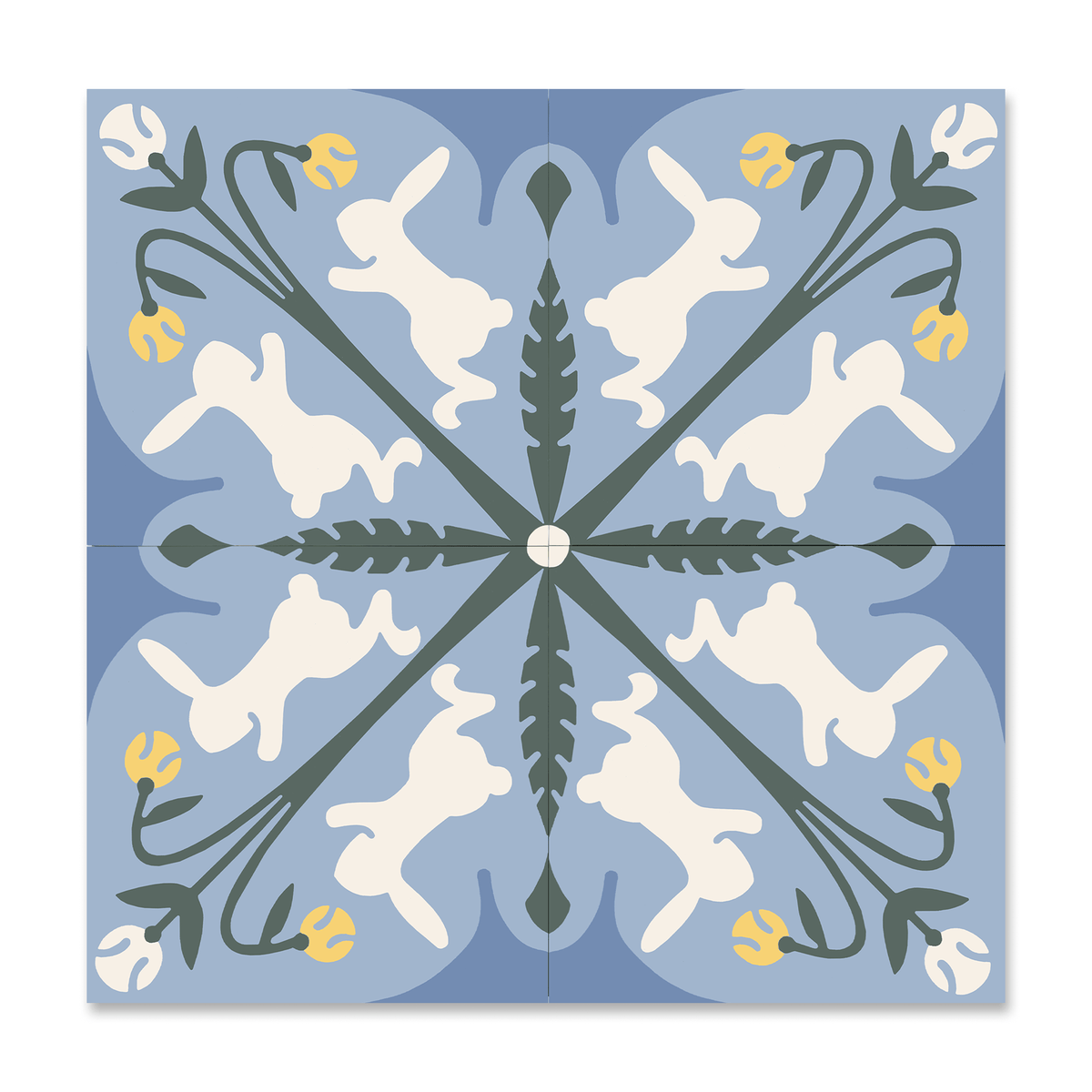 The Rabbits Cement Tile by Adam Trest is one of the most darling designs in the collection, featuring a vintage motif of playful, jumping hares. The retro color palette makes it the perfect accent for Grandmillennial Style interiors. Handcrafted from premium cement, the 8” x 8” Rabbits Tile adds a charming and nostalgic touch to walls, floors, or backsplashes while offering long-lasting durability.