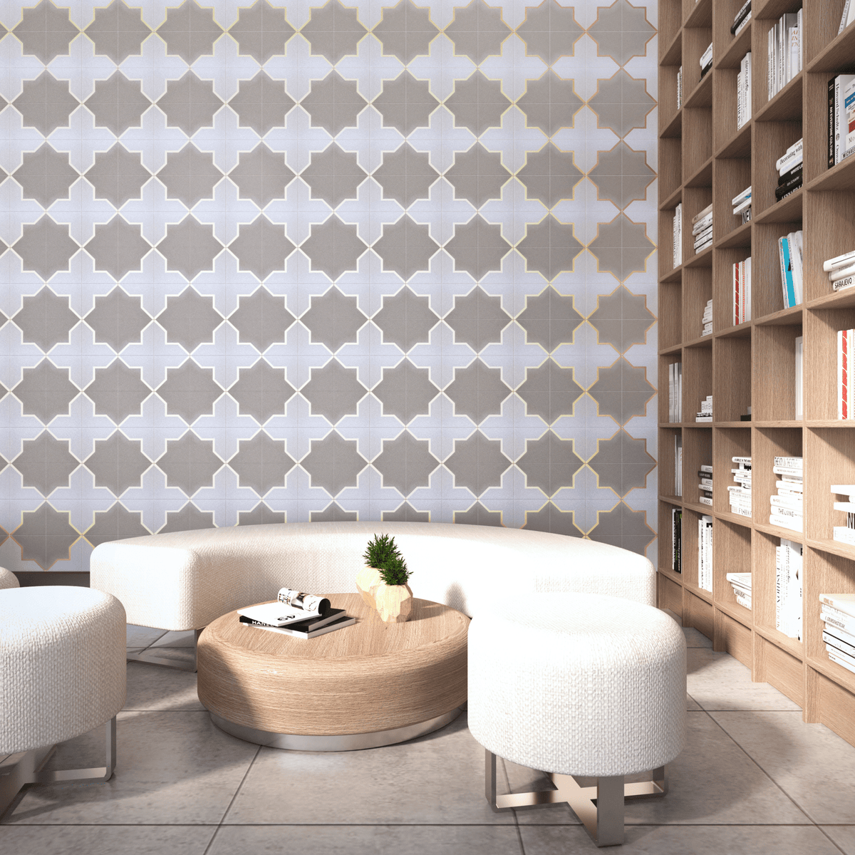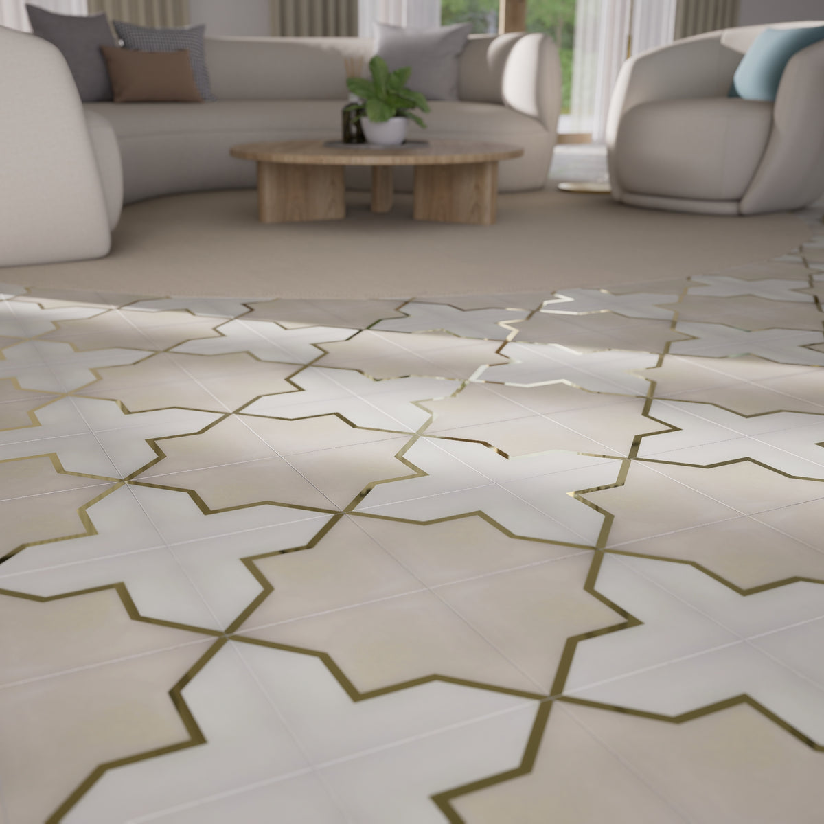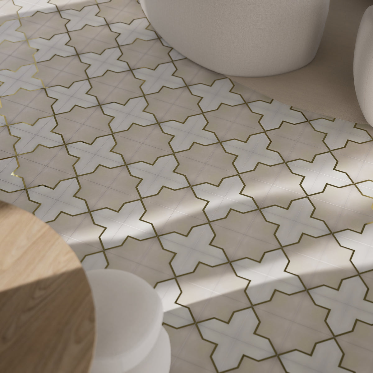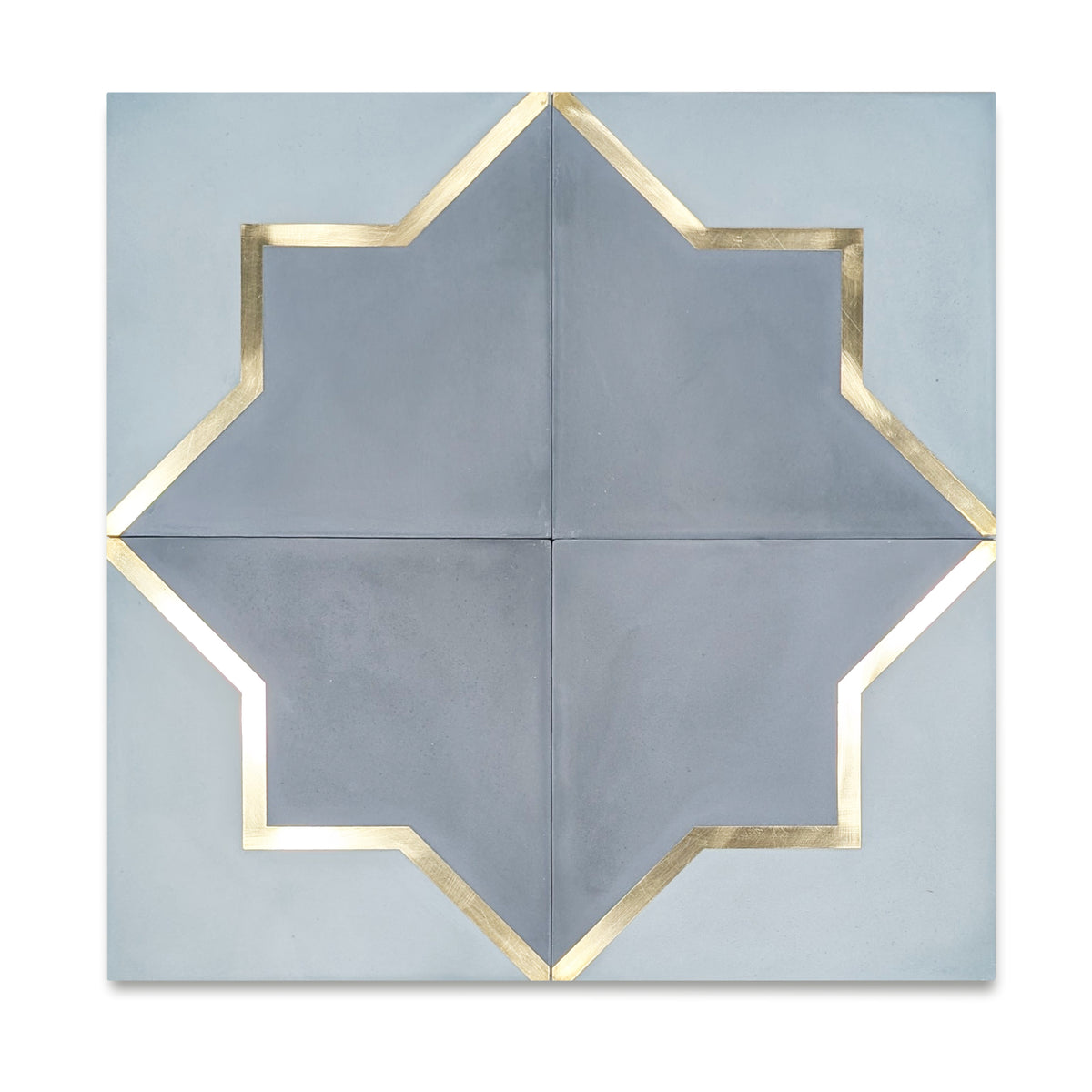 The Fes Cement Tile features a two-toned star design inspired by the intricate tilework of Morocco, enhanced by solid brass inserts for a luxurious touch. Handcrafted from premium cement, this tile is available in two stunning color variations, perfect for adding elegance to walls, floors, or backsplashes. The 8” x 8” Fes Tile blends traditional craftsmanship with modern luxury, making it a standout choice for any space.