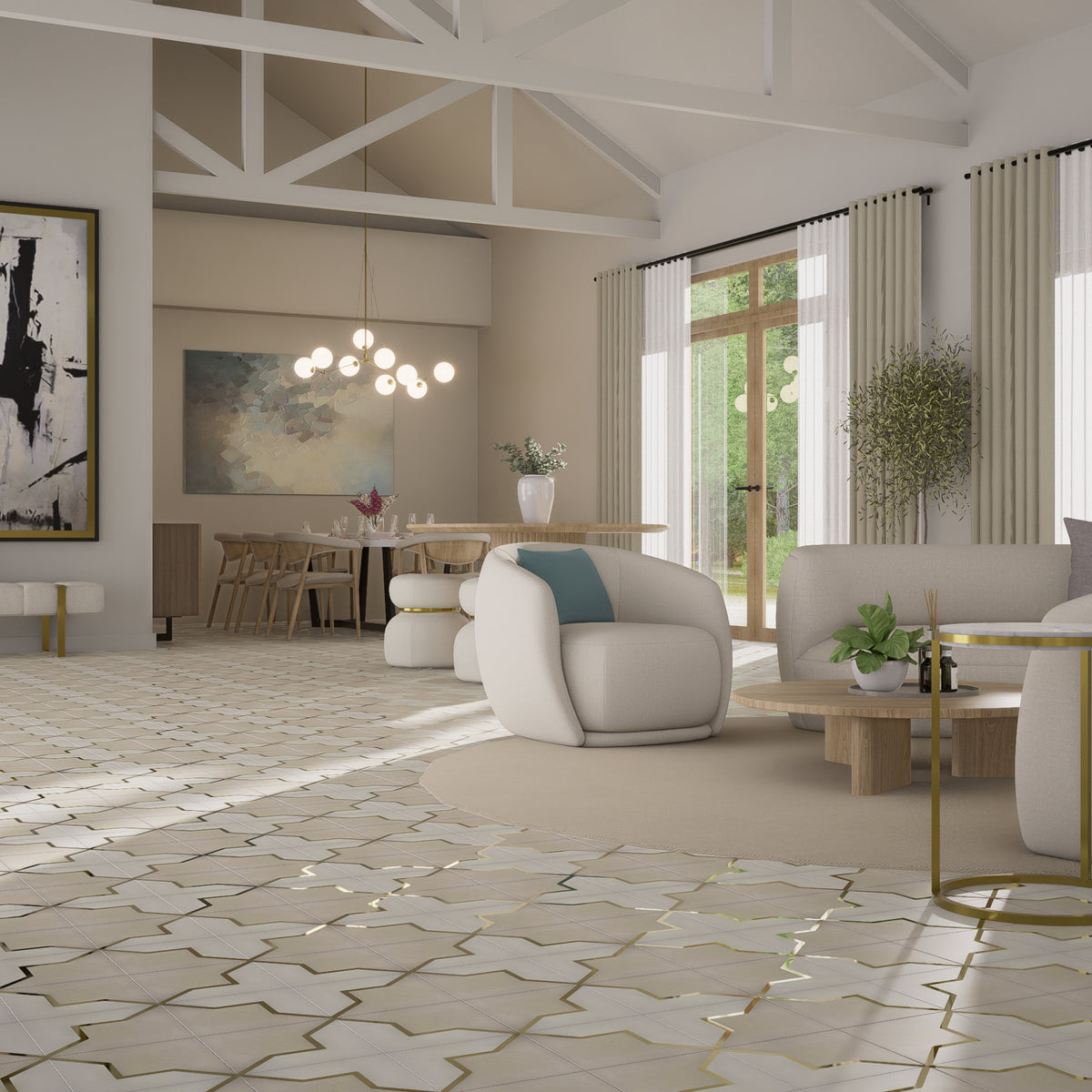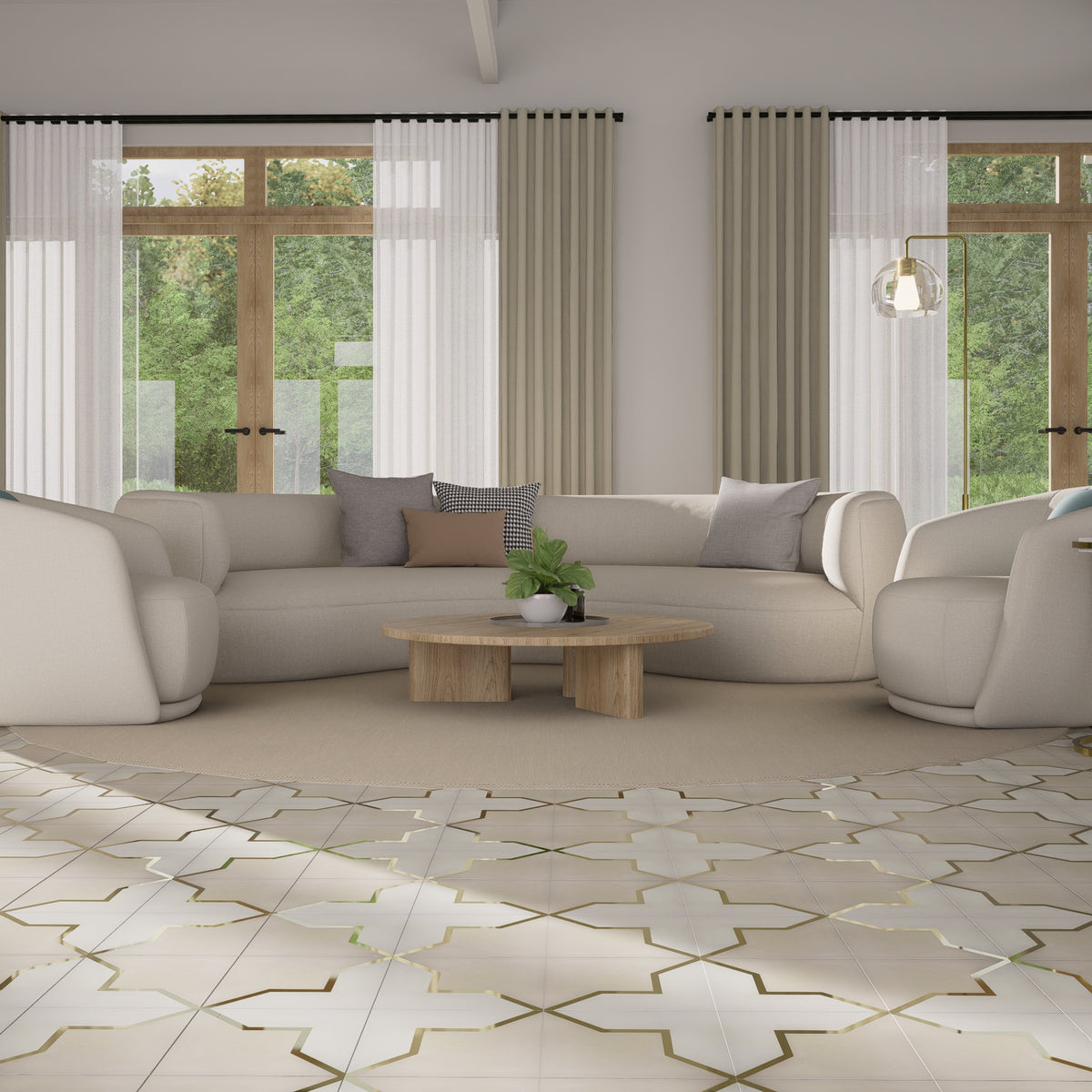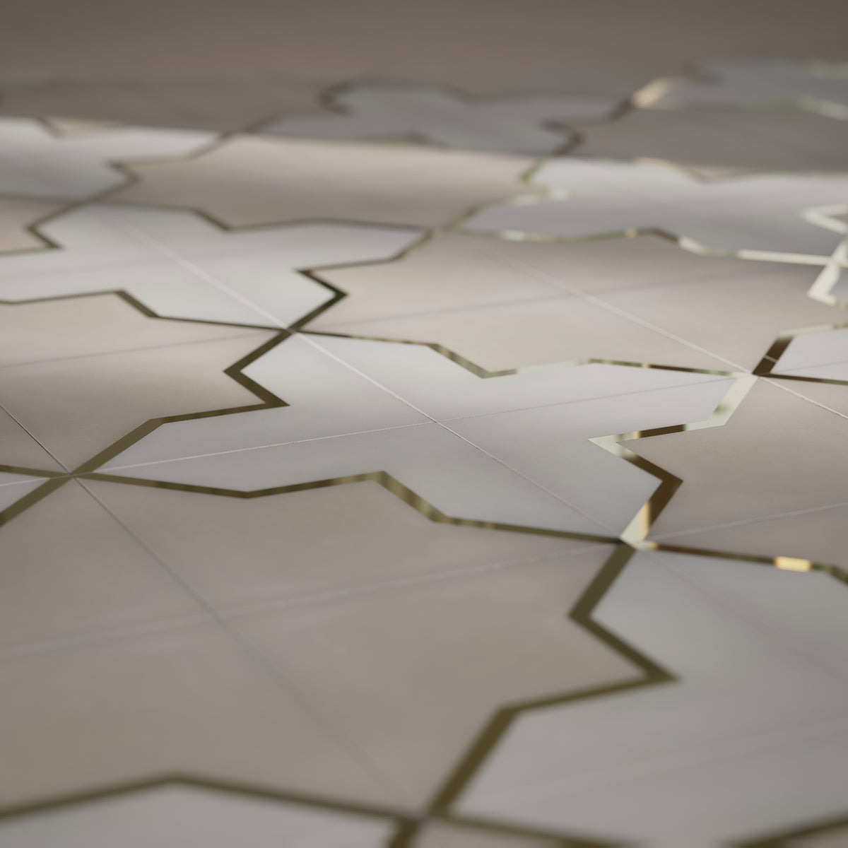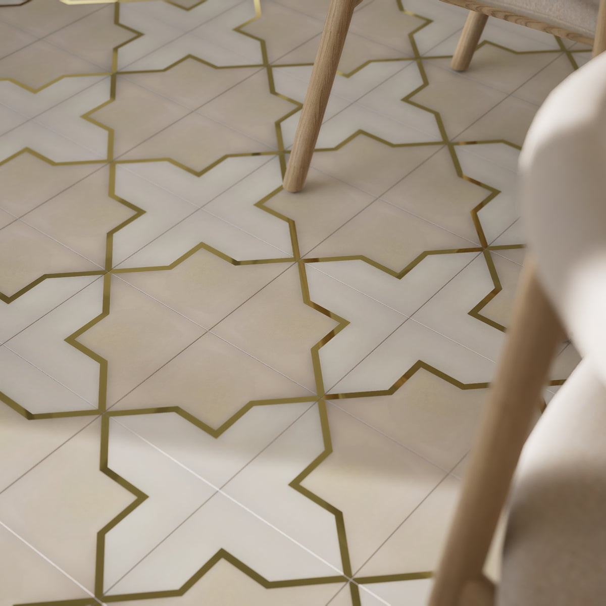 The Fes Cement Tile features a two-toned star design inspired by the intricate tilework of Morocco, enhanced by solid brass inserts for a luxurious touch. Handcrafted from premium cement, this tile is available in two stunning color variations, perfect for adding elegance to walls, floors, or backsplashes. The 8” x 8” Fes Tile blends traditional craftsmanship with modern luxury, making it a standout choice for any space.