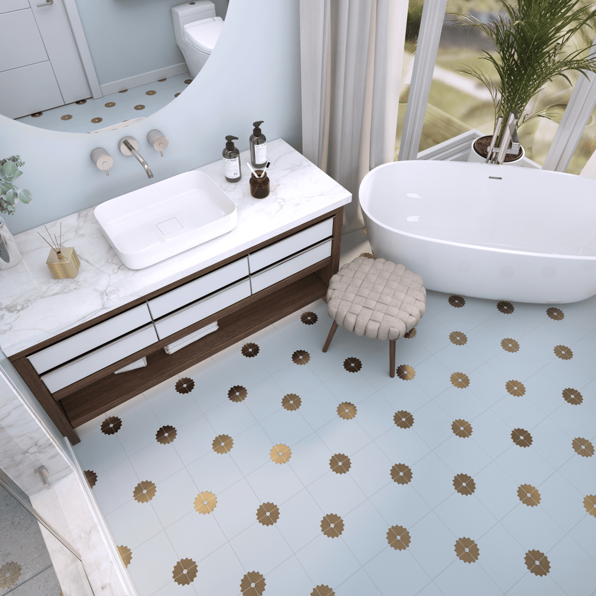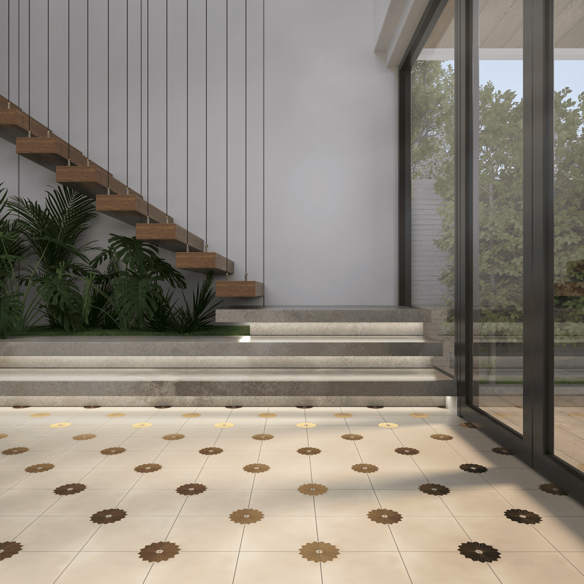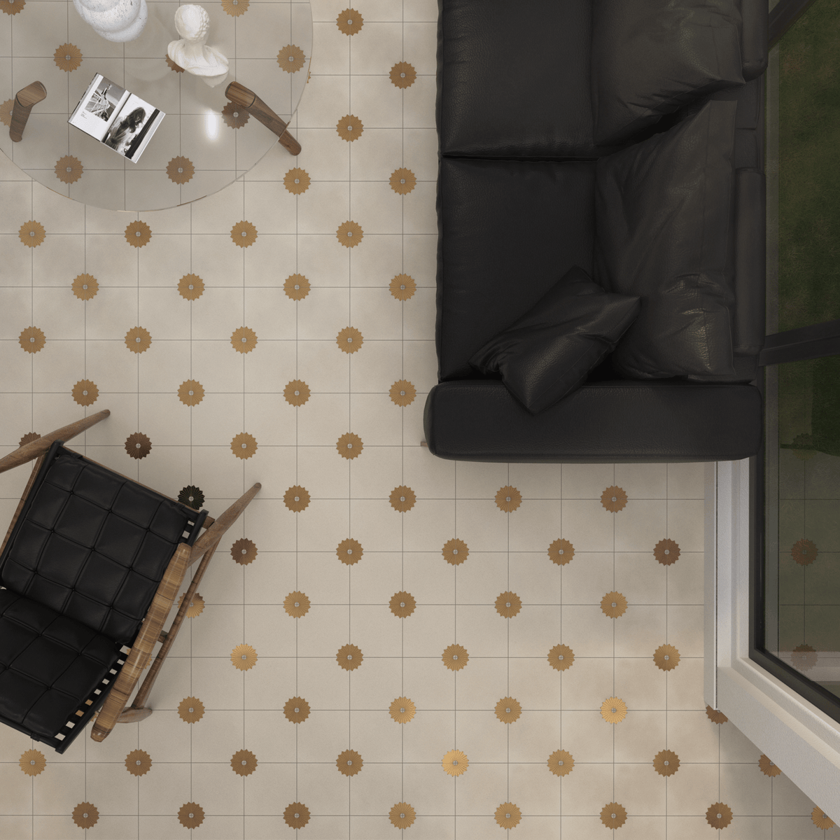 Inspired by the freshly blossomed magnolia flower, the Magnolia Cement Tile brings a touch of natural elegance to any space. Featuring an etched brass accent that dazzles in the light, this 8” x 8” handcrafted cement tile is available in two elegant variations. Perfect for walls, floors, or backsplashes, the Magnolia Tile combines floral beauty with durable craftsmanship, creating a stunning focal point in any room.