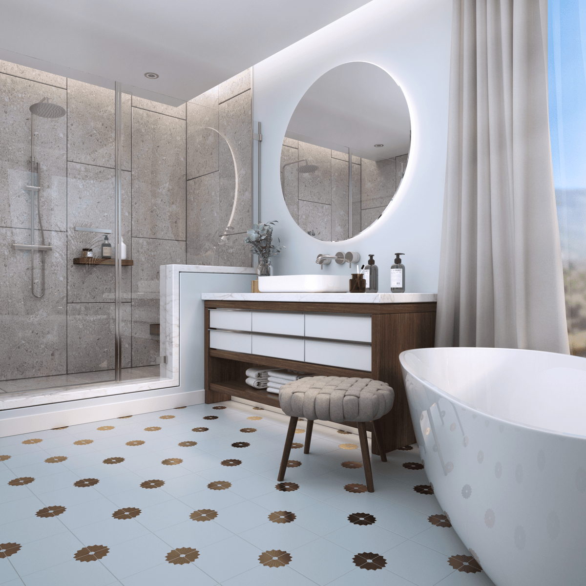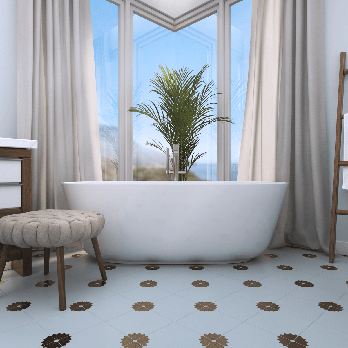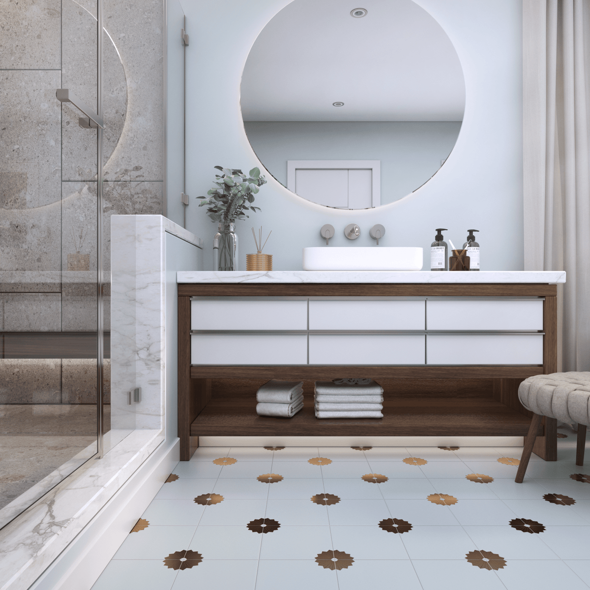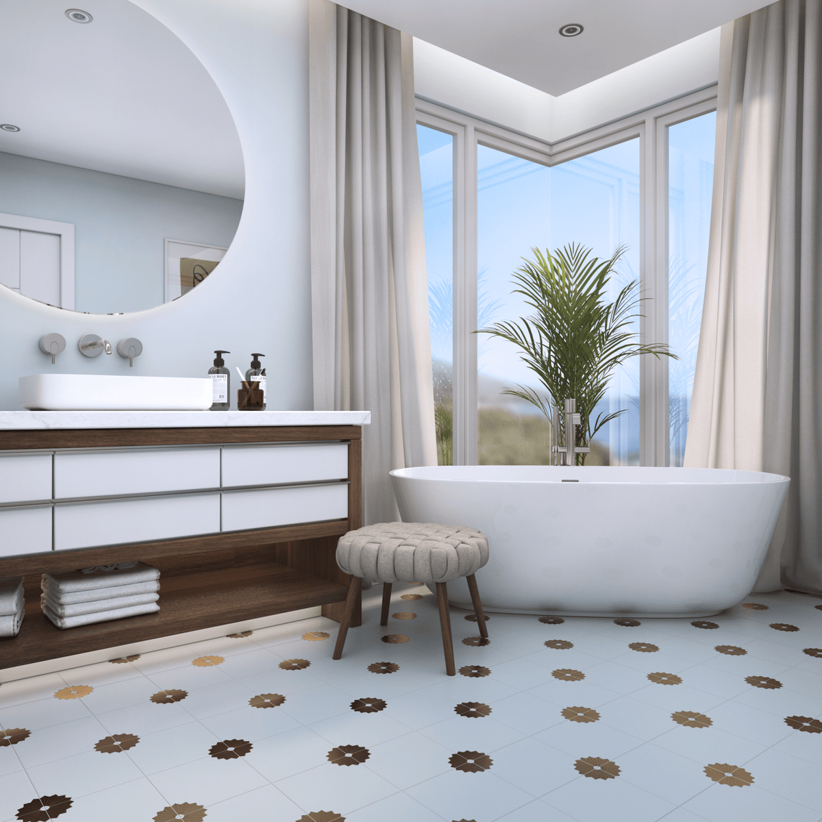 Inspired by the freshly blossomed magnolia flower, the Magnolia Cement Tile brings a touch of natural elegance to any space. Featuring an etched brass accent that dazzles in the light, this 8” x 8” handcrafted cement tile is available in two elegant variations. Perfect for walls, floors, or backsplashes, the Magnolia Tile combines floral beauty with durable craftsmanship, creating a stunning focal point in any room.