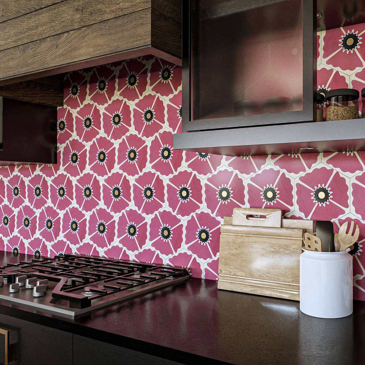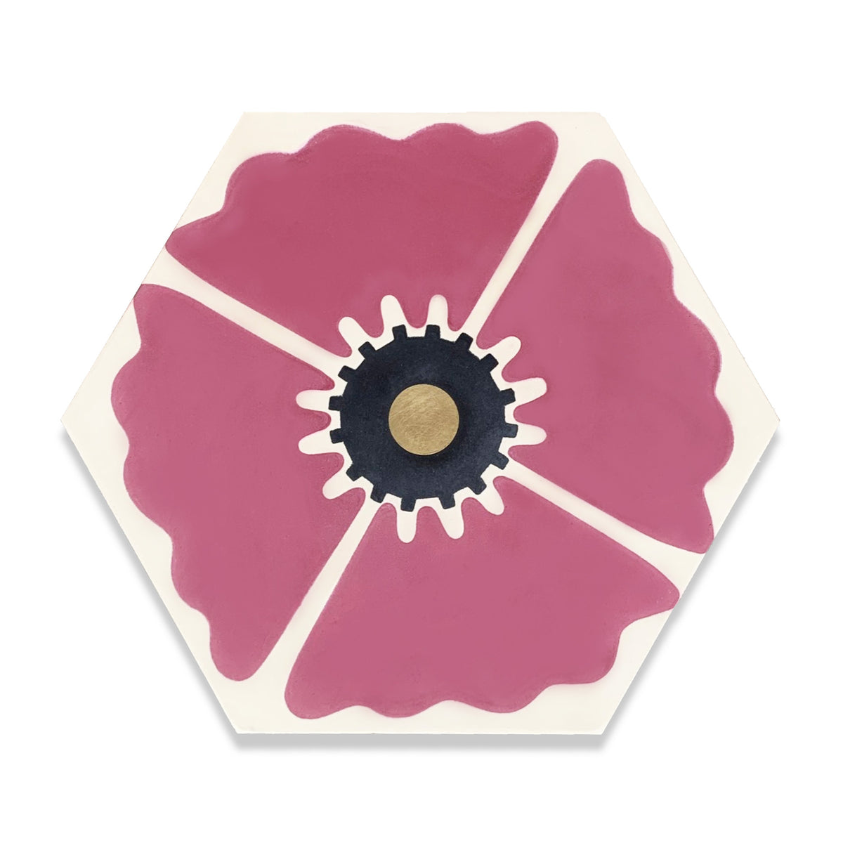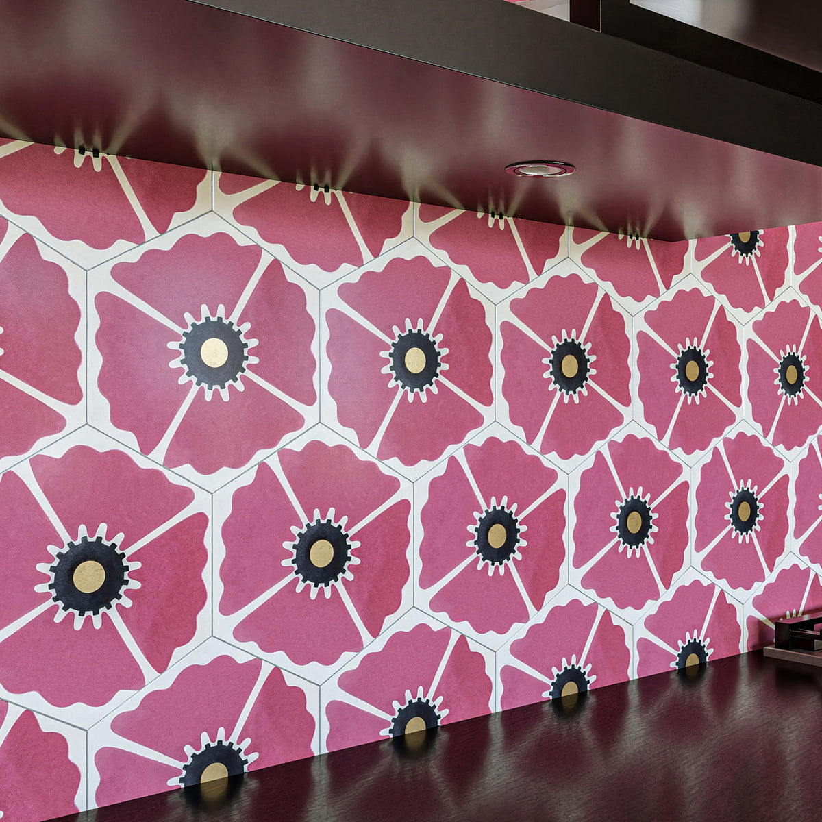The 8” x 9” Opi tile features a striking hexagonal design, with a bold pink flower radiating from a central black and gold accent. The clean, minimalist layout is enhanced by the rich color palette, making this tile an ideal choice for creating standout feature walls or floors. Designed by Hollis Callas.