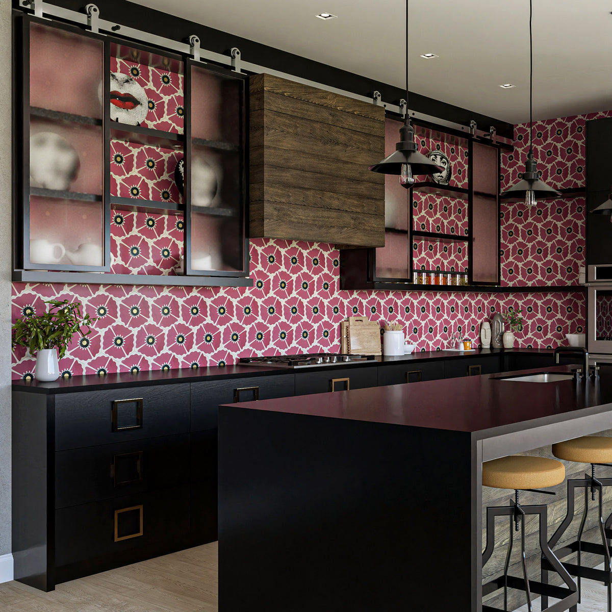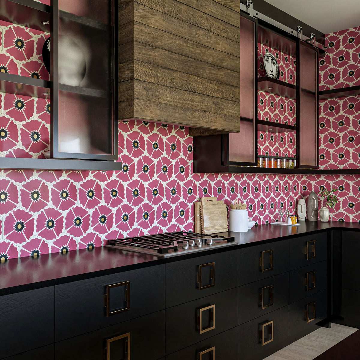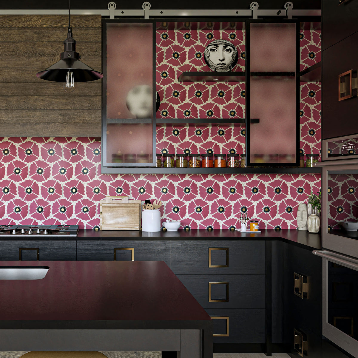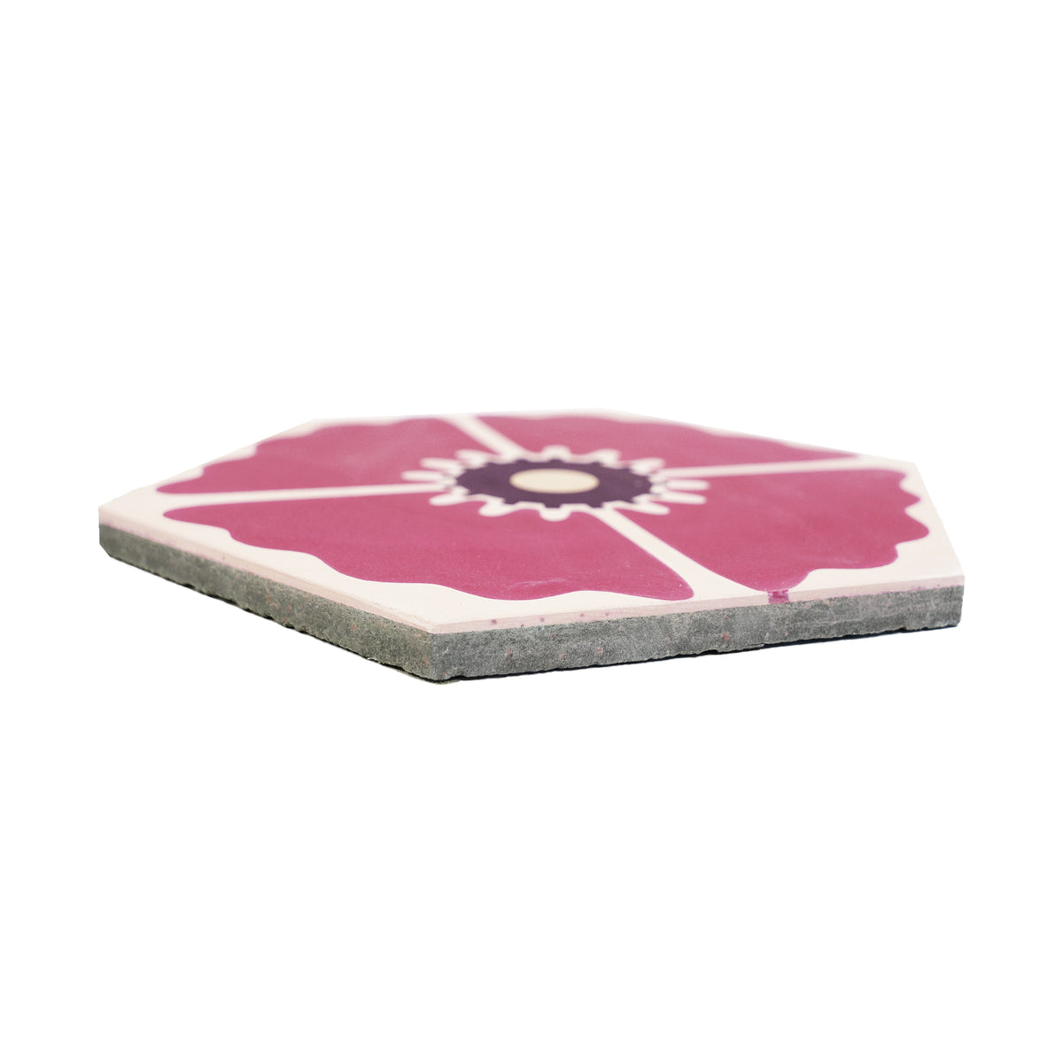 The 8” x 9” Opi tile features a striking hexagonal design, with a bold pink flower radiating from a central black and gold accent. The clean, minimalist layout is enhanced by the rich color palette, making this tile an ideal choice for creating standout feature walls or floors. Designed by Hollis Callas.
