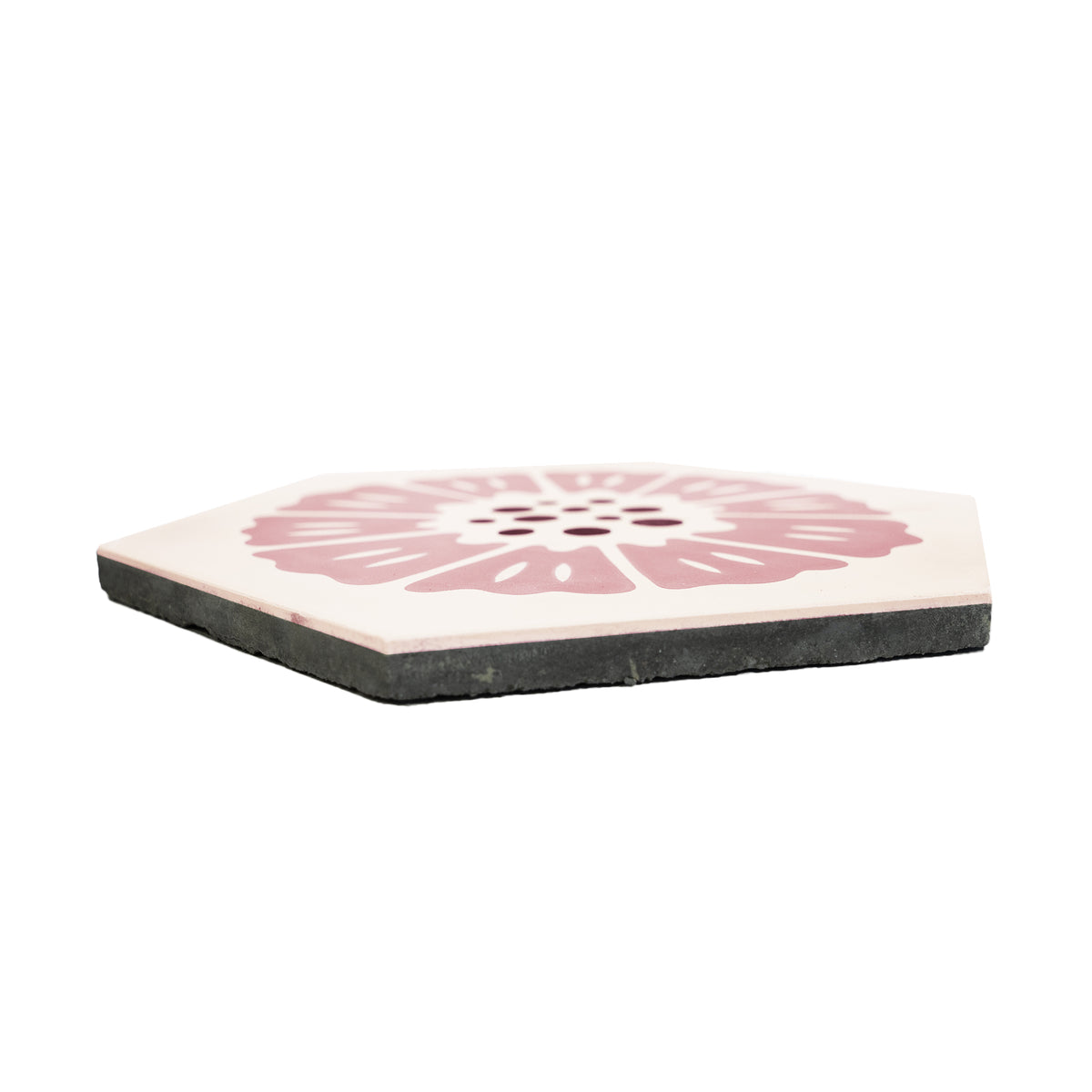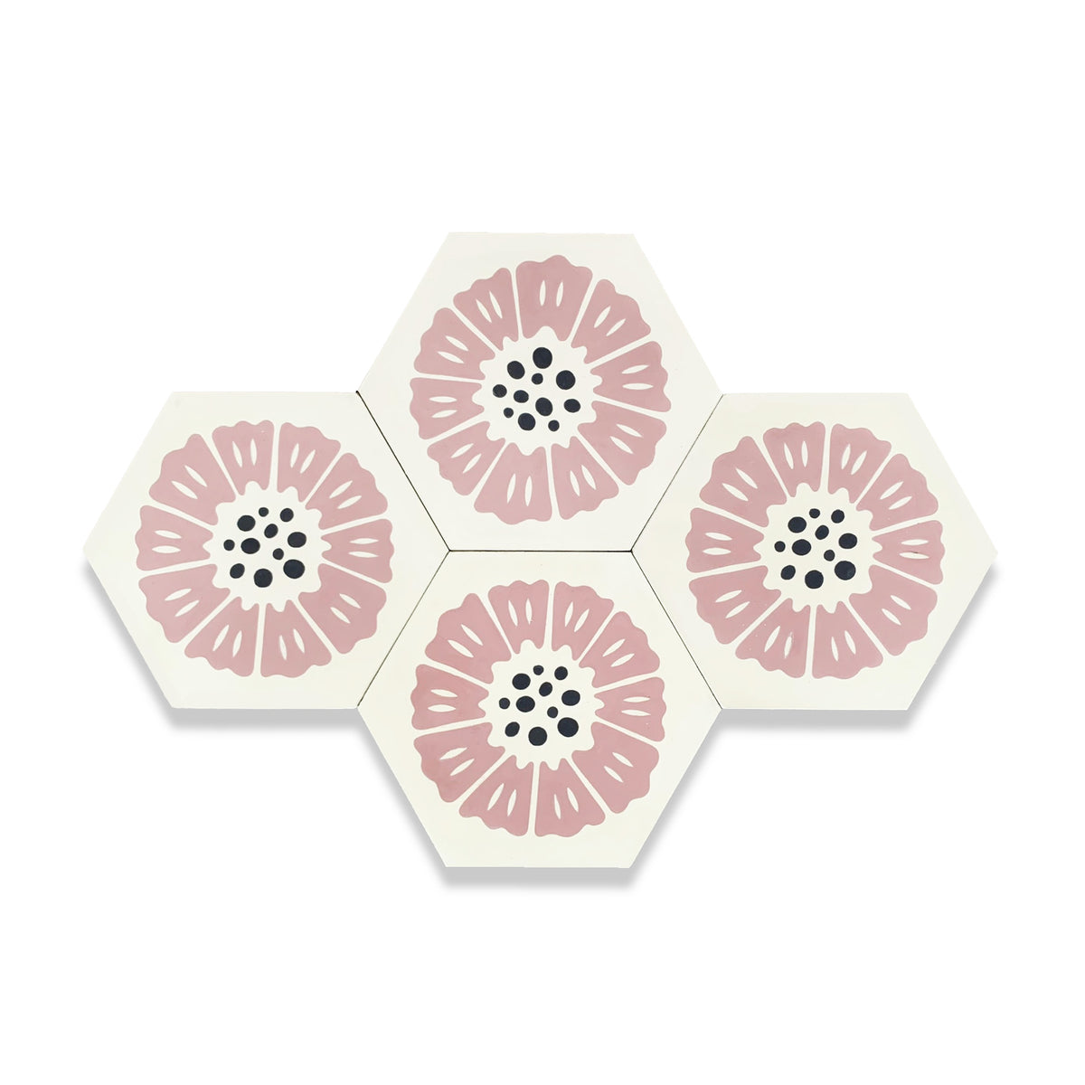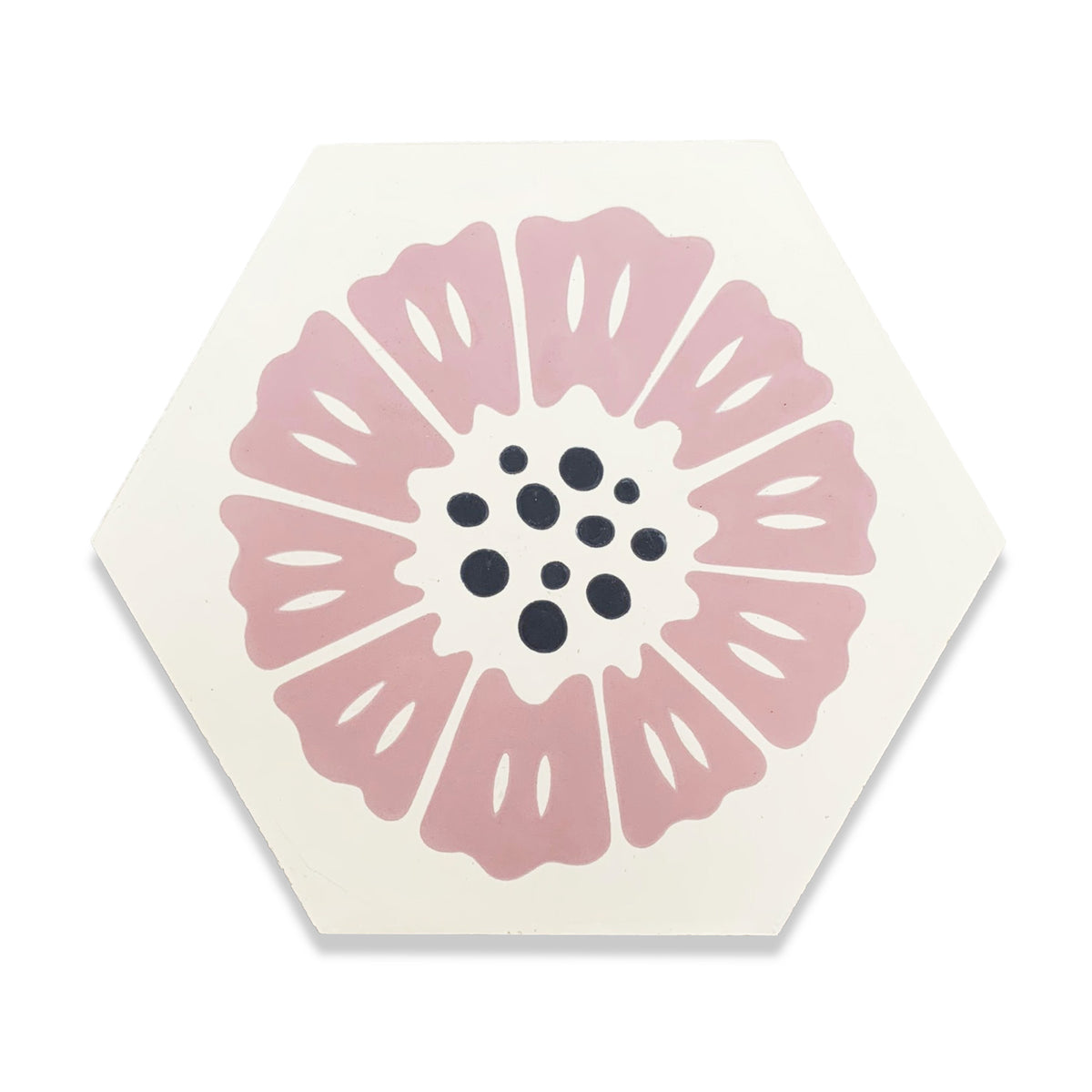 The Peonia Cement tile features a delicate pink floral design on a unique hexagonal shape, with bold black dots at its center for contrast. This modern yet charming 8” x 9” tile is perfect for adding a soft, elegant touch to kitchens, bathrooms, and statement walls. Designed by Hollis Callas, Peonia combines artistry and sophistication to elevate any space.