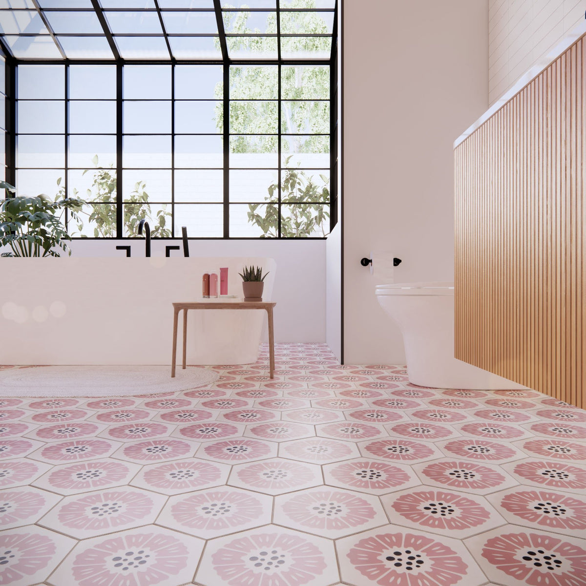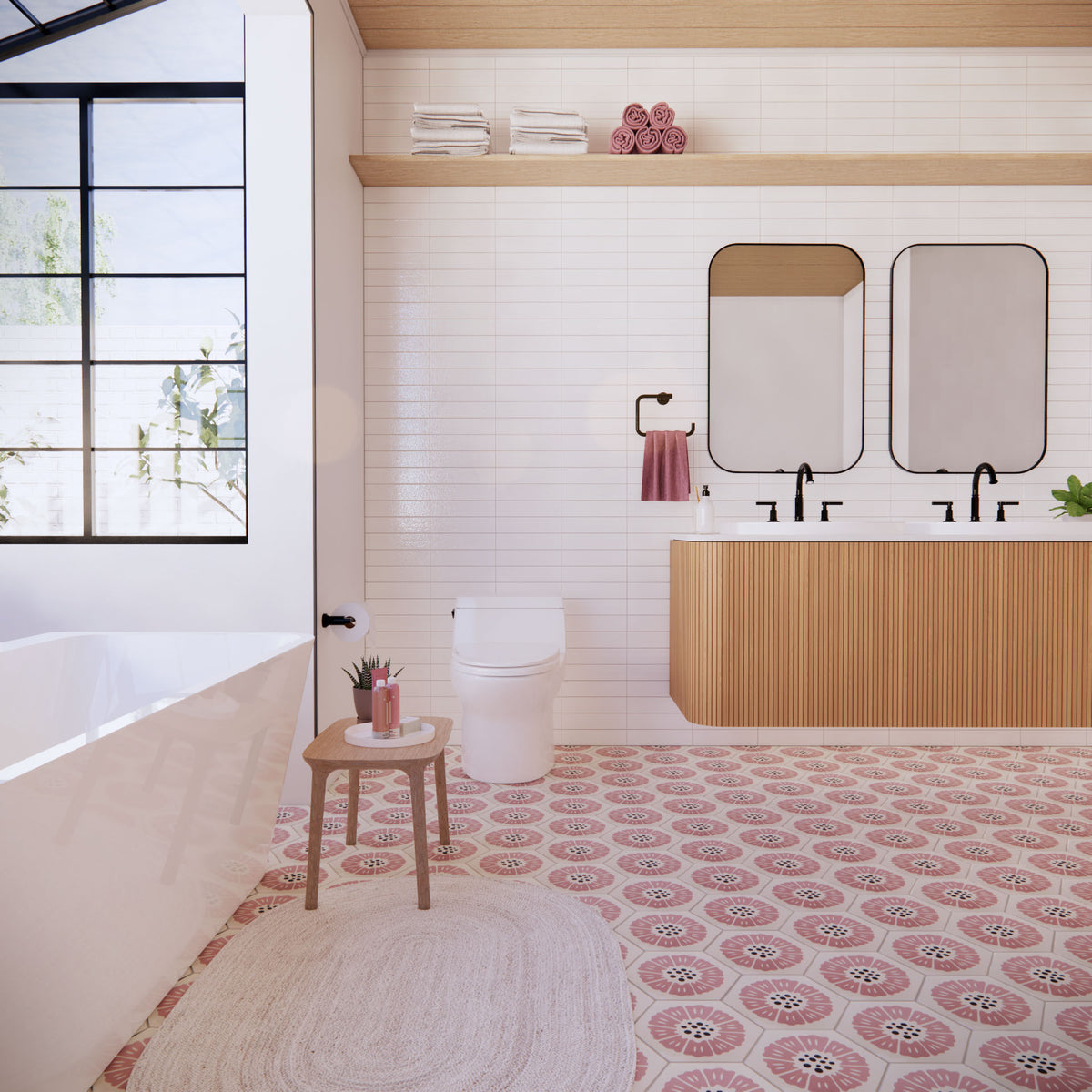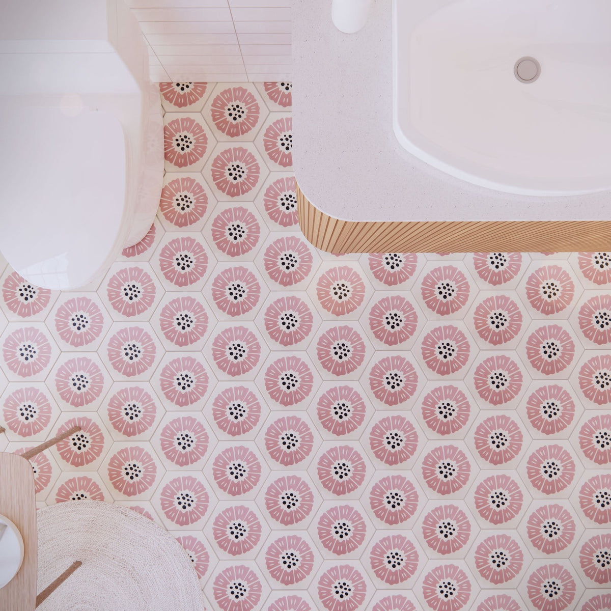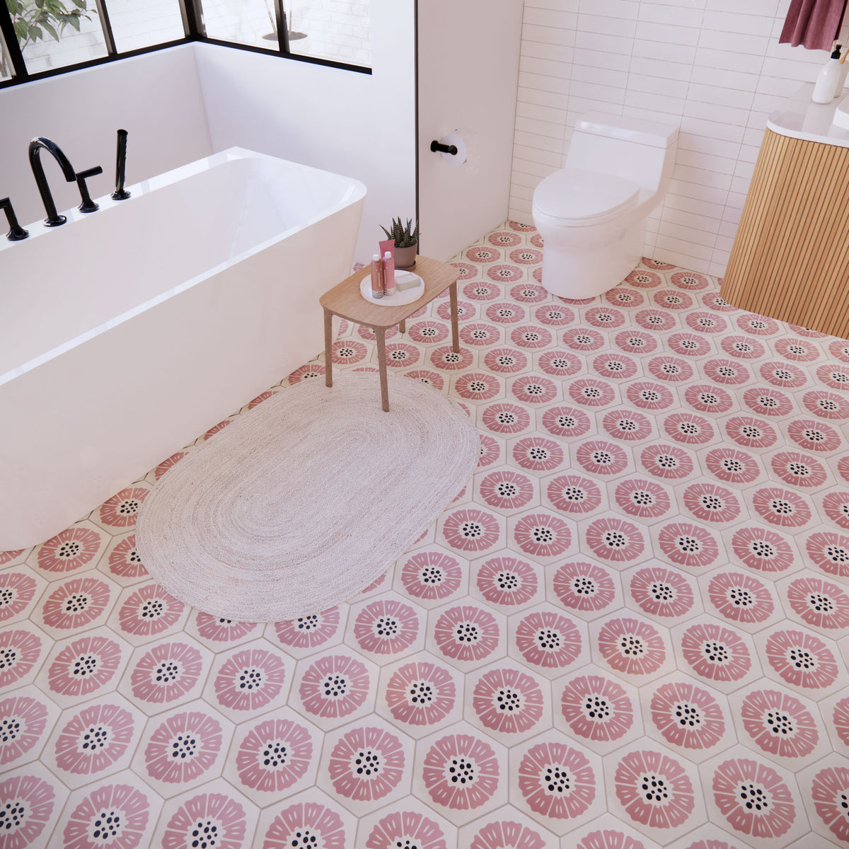 The Peonia Cement tile features a delicate pink floral design on a unique hexagonal shape, with bold black dots at its center for contrast. This modern yet charming 8” x 9” tile is perfect for adding a soft, elegant touch to kitchens, bathrooms, and statement walls. Designed by Hollis Callas, Peonia combines artistry and sophistication to elevate any space.