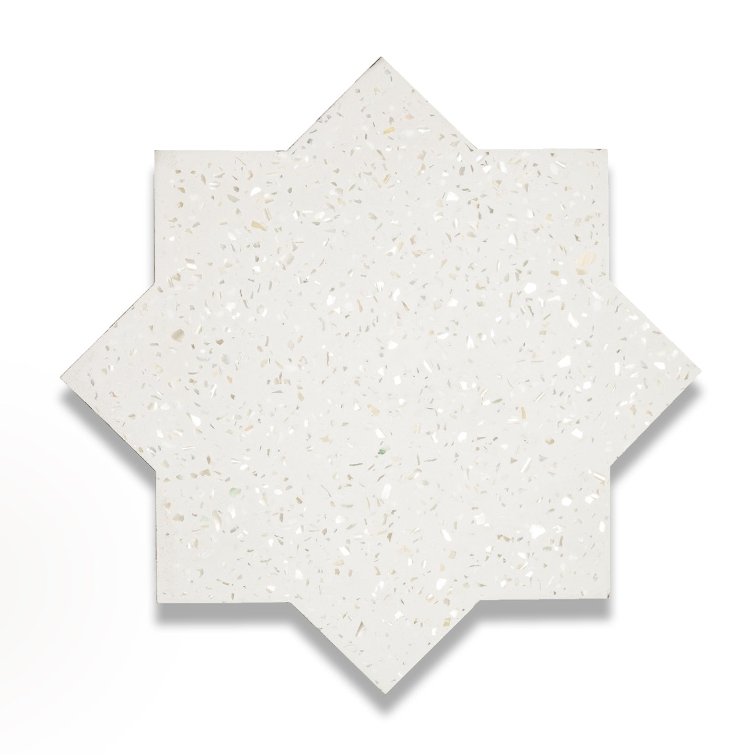 The Eden Mother of Pearl Terrazzo Cement Tile brings a timeless geometric pattern to life with the added luxury of real Mother of Pearl pieces embedded in premium cement. These shimmering accents catch the sunlight, adding elegance and sparkle to any room. Perfect for walls, floors, or backsplashes, the 8” x 8” Eden MP Tile combines classic design with modern sophistication, creating a striking and durable feature for any space.