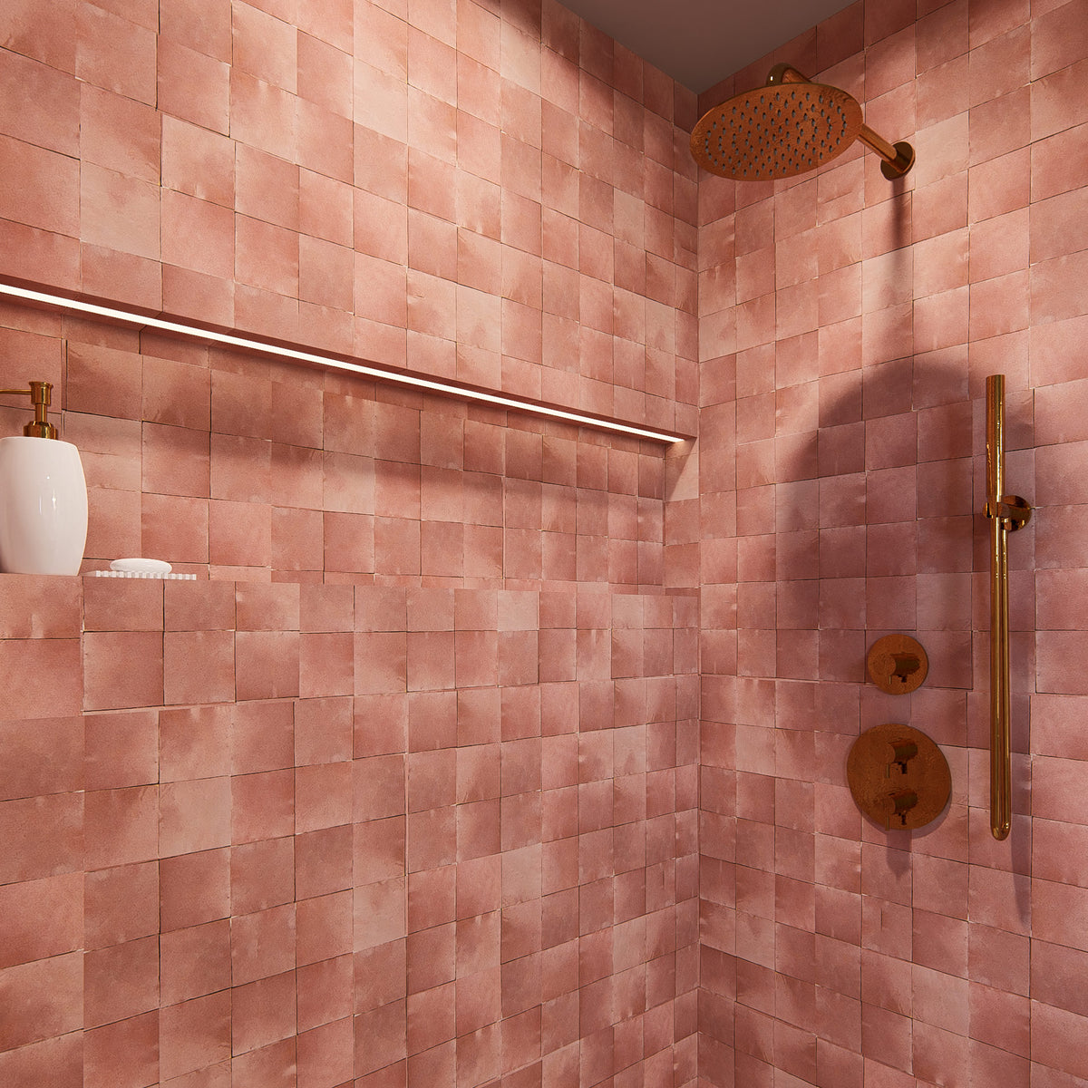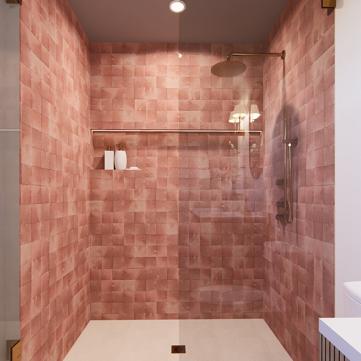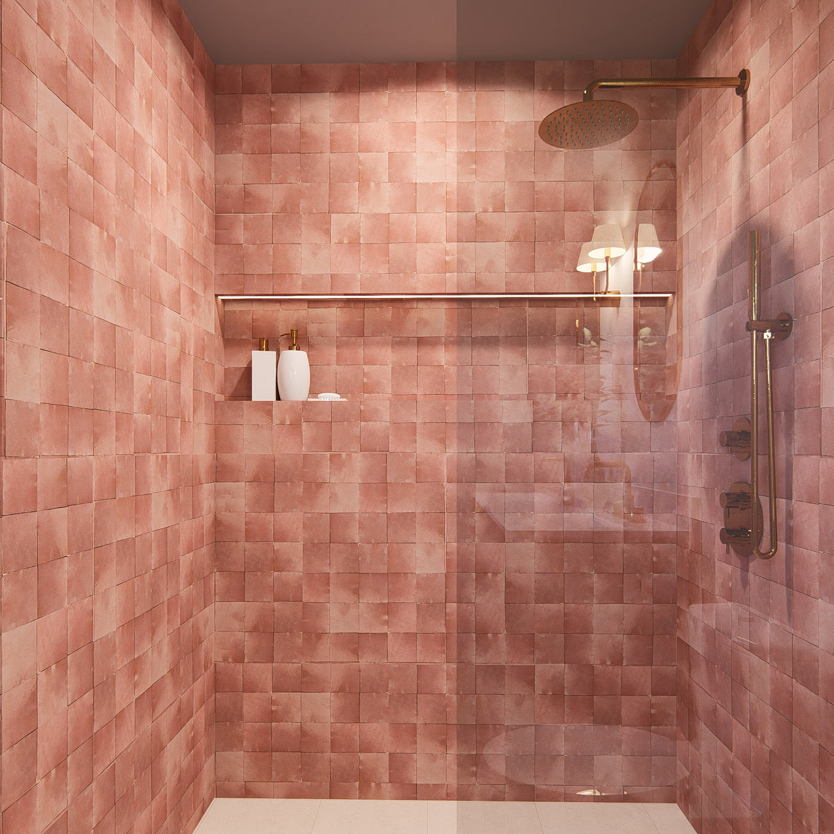 Our Rabat Rose 4x4 tiles exude soft elegance and warmth, with their delicate blush pink tones reminiscent of blooming roses at dawn. Handcrafted to perfection, each Zellige tile showcases subtle variations in hue and texture, adding depth and character to your design. Ideal for creating romantic backsplashes, serene bathroom walls, or inviting feature areas, these tiles bring a touch of timeless beauty and artisanal charm.