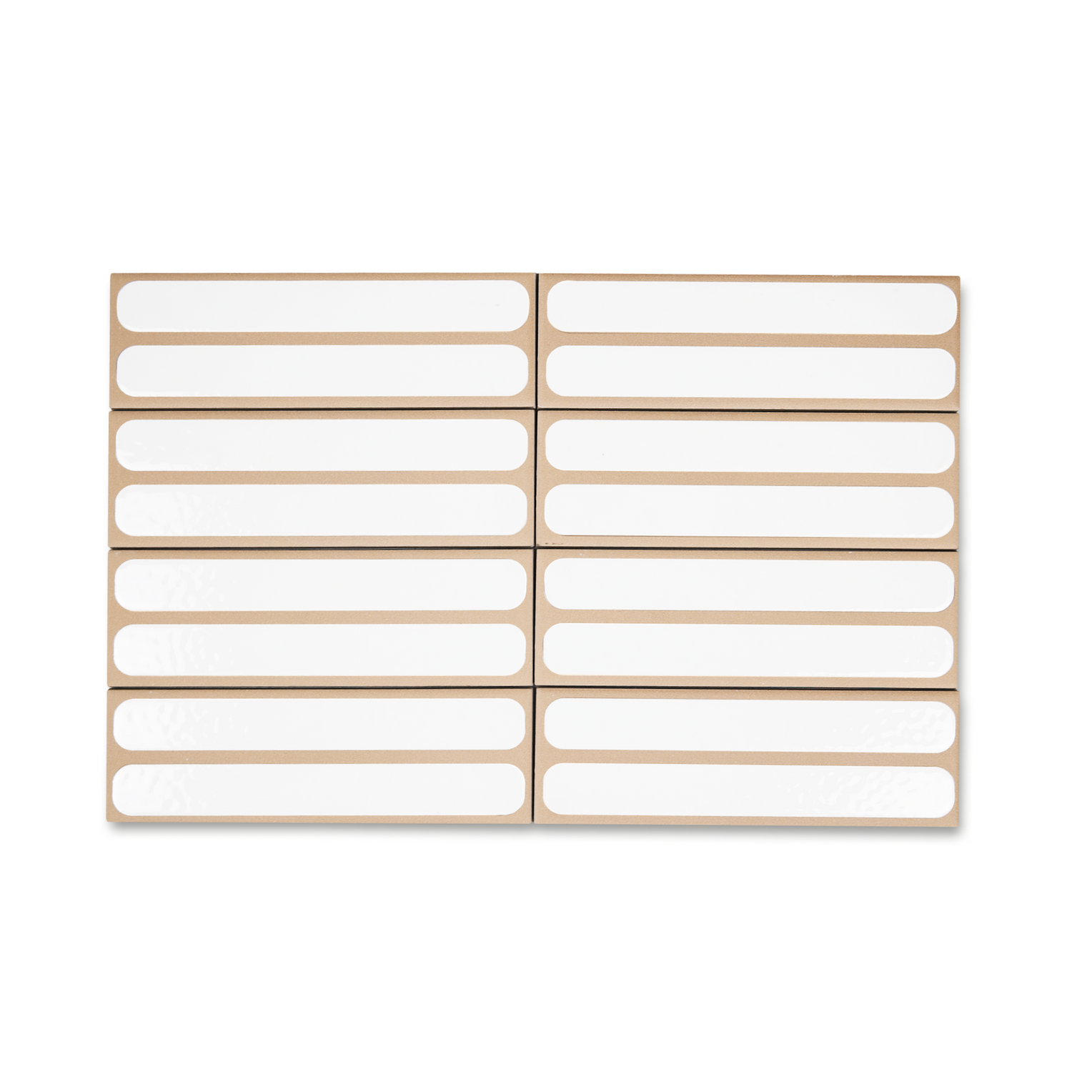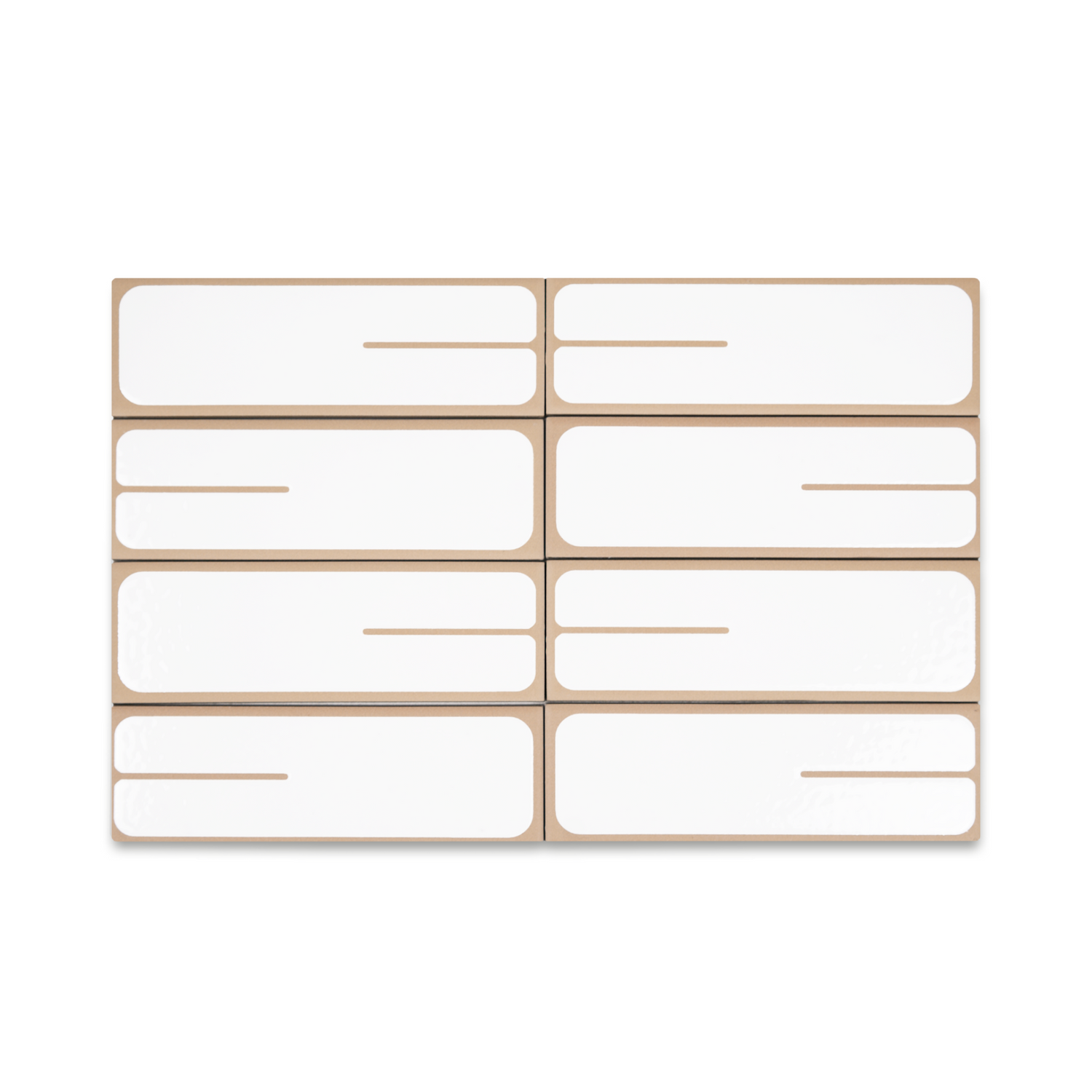 The Stack porcelain tile reimagines a linear pattern with a soft, graphic touch. Crafted from high-quality porcelain in a 2" x 6" format, this design features a gently hued base - available in Oyster, Toast, Blueberry, and Fennel - with two rounded rectangular insets of crisp white that add playful geometry and subtle contrast. The glazed accents soften the form and introduce dimensional depth, making it an ideal feature tile.