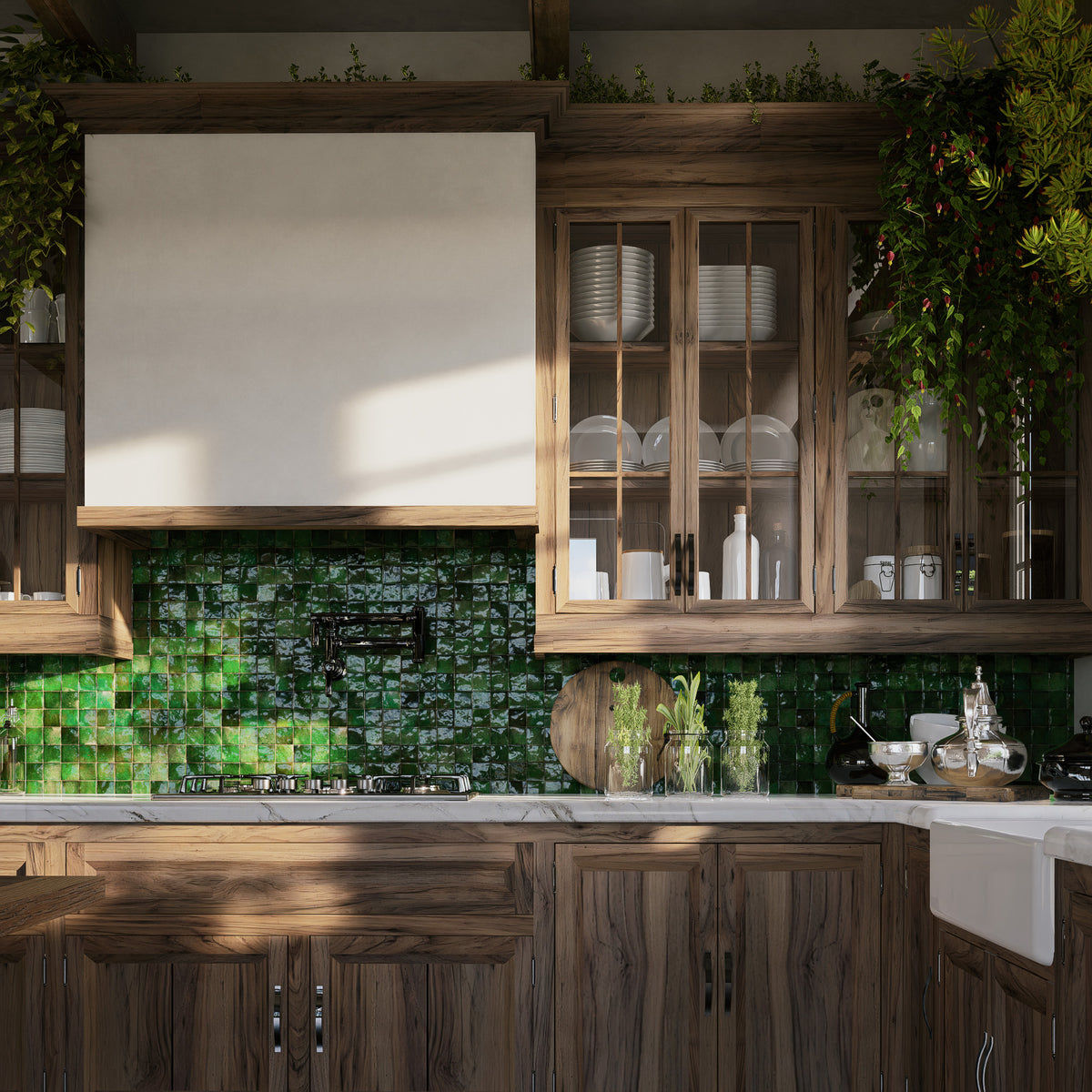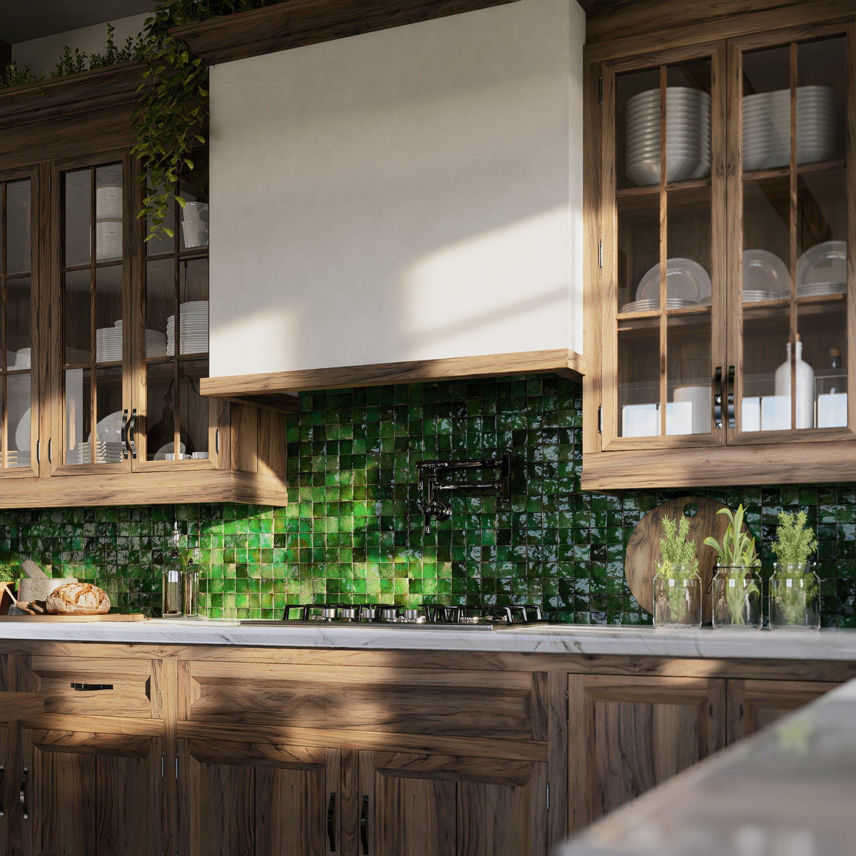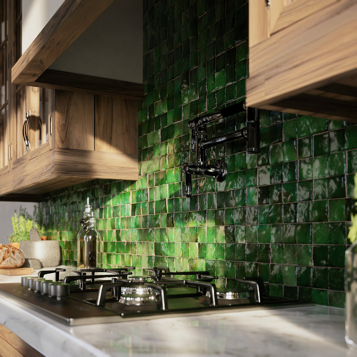 Bring the vibrant energy of Moroccan medinas into your home with the Medina Emerald Zellige Tiles in a 2x2 mosaic format. These tiles, meticulously handcrafted from natural Moroccan clay and mounted on a 12x12 sheet for easy installation, capture the color of gleaming emeralds nestled among the lively souks of Moroccan medinas