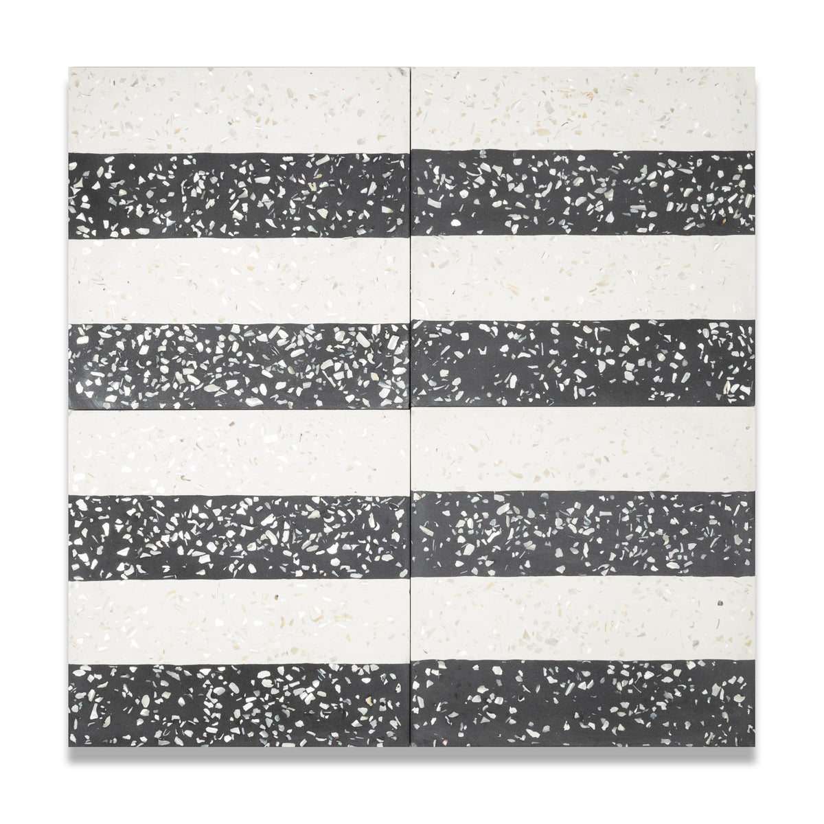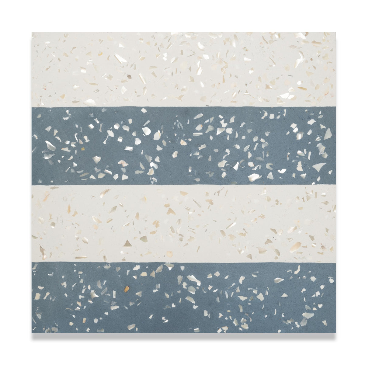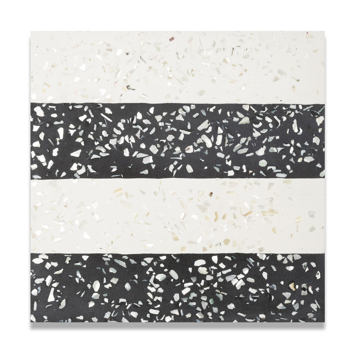 The Sefi Mother of Pearl Terrazzo Cement Tile features a modern design with contrasting stripes, enhanced by real pieces of Mother of Pearl terrazzo that add just the right touch of shimmer. Handcrafted from premium cement, this 8” x 8” tile combines contemporary style with a bit of sparkle, perfect for creating a refined yet eye-catching look in walls, floors, or backsplashes.