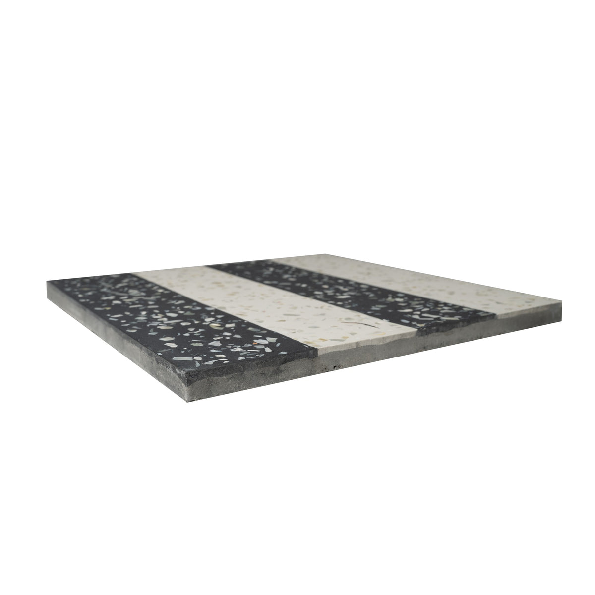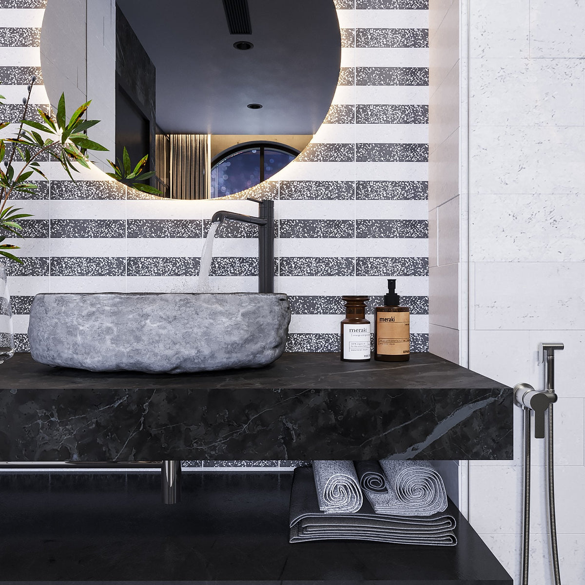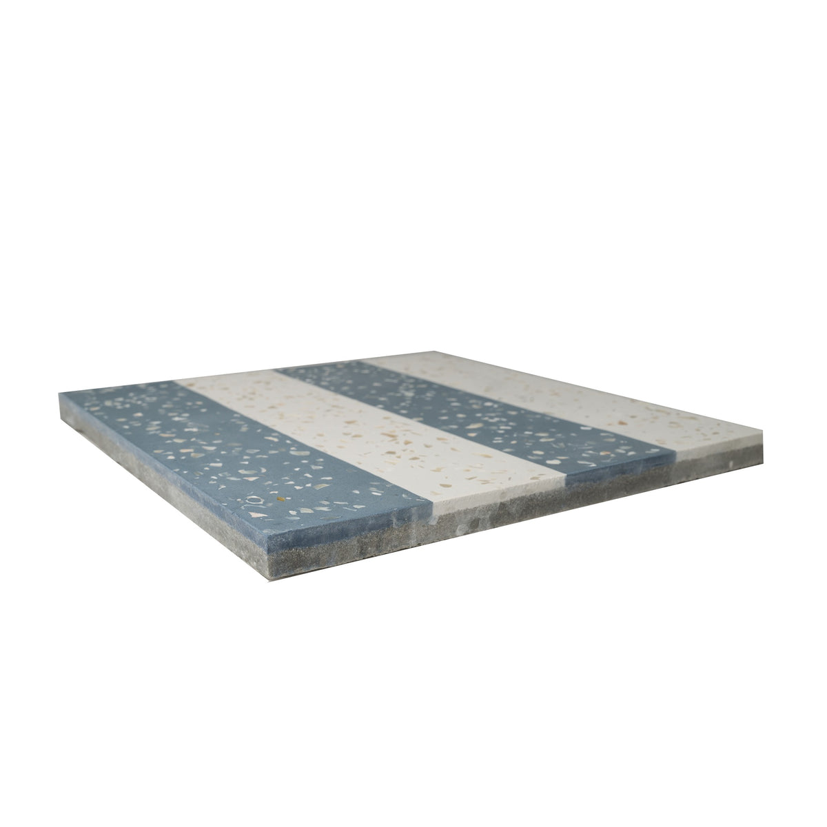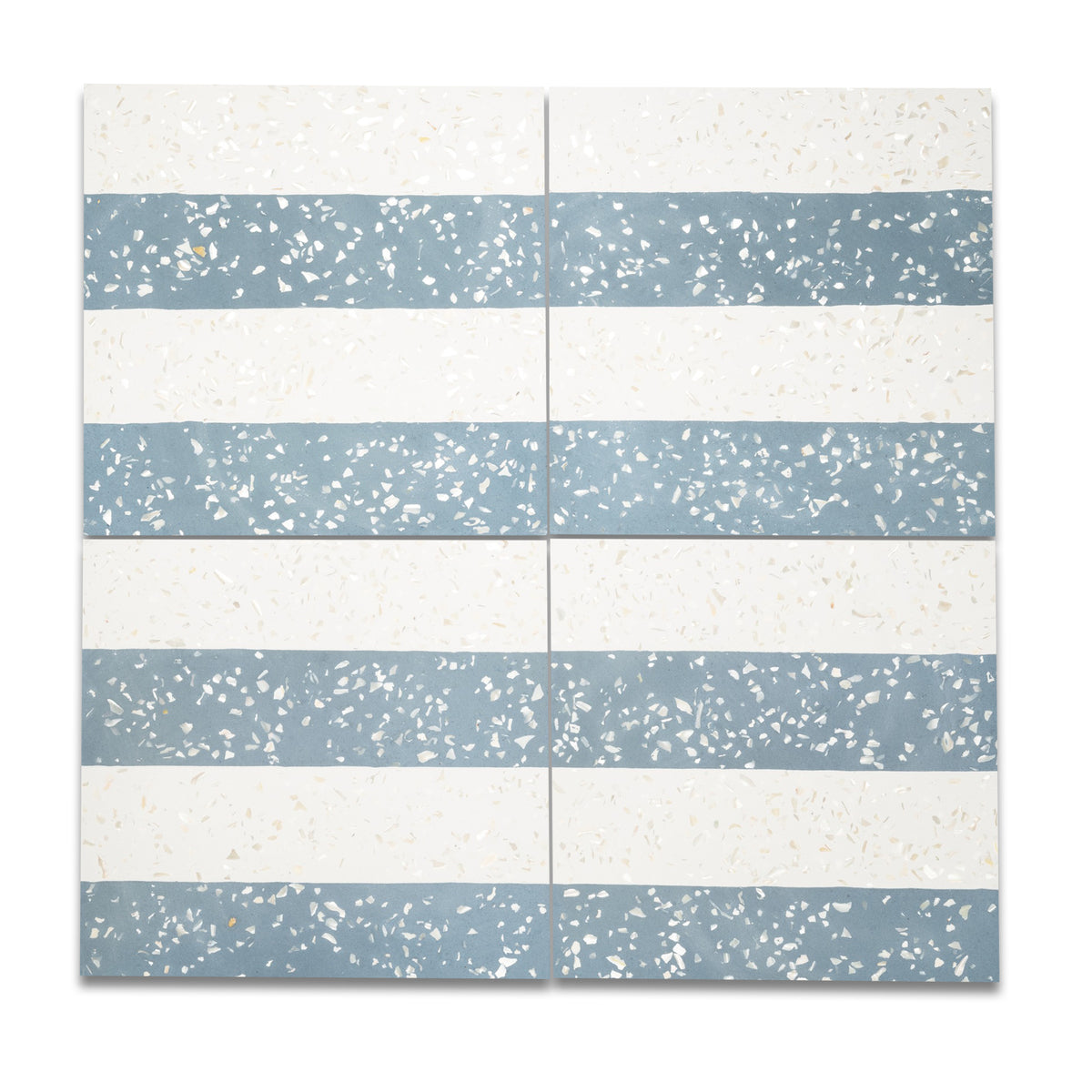The Sefi Mother of Pearl Terrazzo Cement Tile features a modern design with contrasting stripes, enhanced by real pieces of Mother of Pearl terrazzo that add just the right touch of shimmer. Handcrafted from premium cement, this 8” x 8” tile combines contemporary style with a bit of sparkle, perfect for creating a refined yet eye-catching look in walls, floors, or backsplashes.