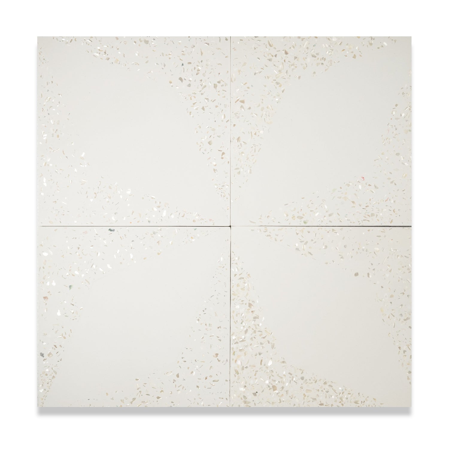 The Eden Mother of Pearl Terrazzo Cement Tile brings a timeless geometric pattern to life with the added luxury of real Mother of Pearl pieces embedded in premium cement. These shimmering accents catch the sunlight, adding elegance and sparkle to any room. Perfect for walls, floors, or backsplashes, the 8” x 8” Eden MP Tile combines classic design with modern sophistication, creating a striking and durable feature for any space.