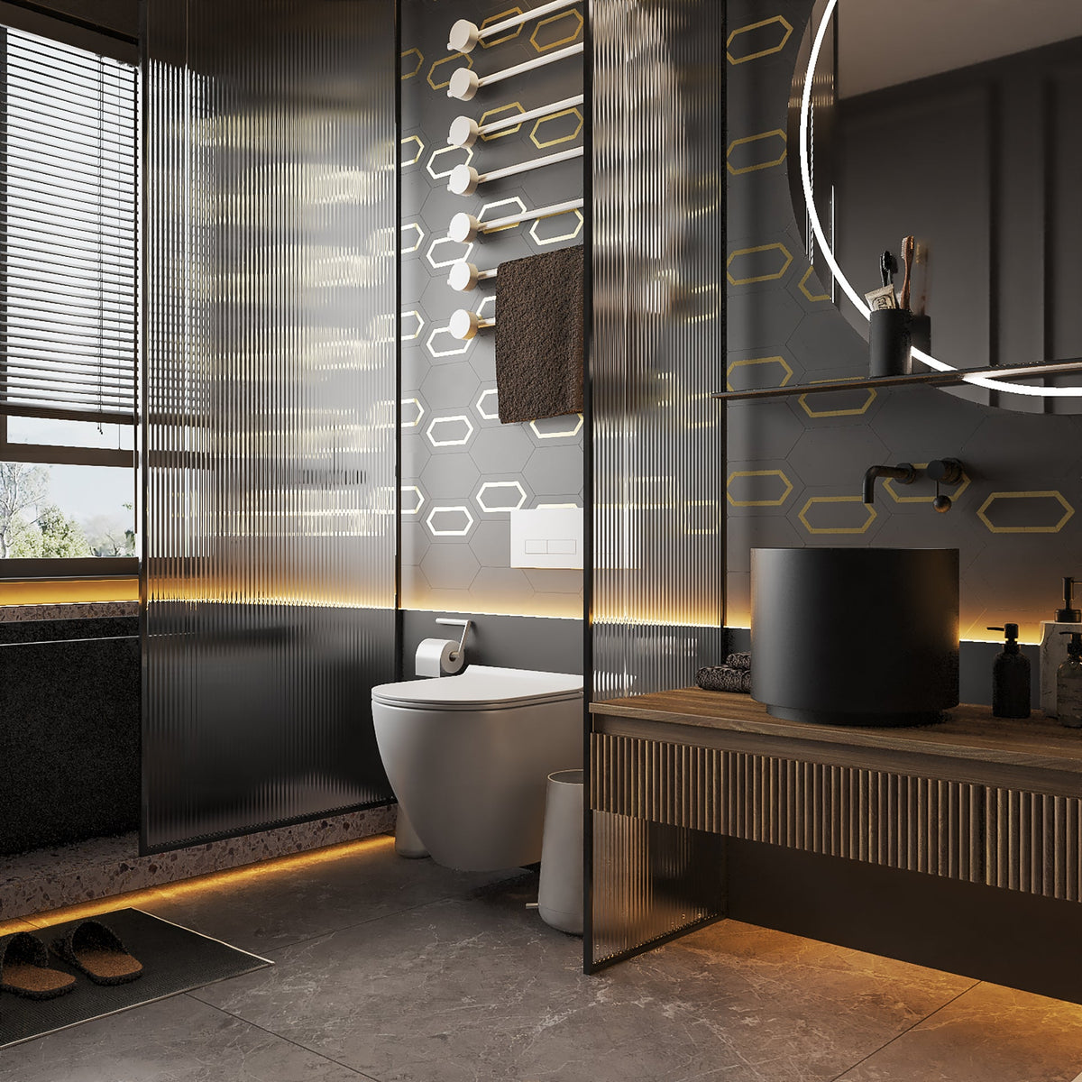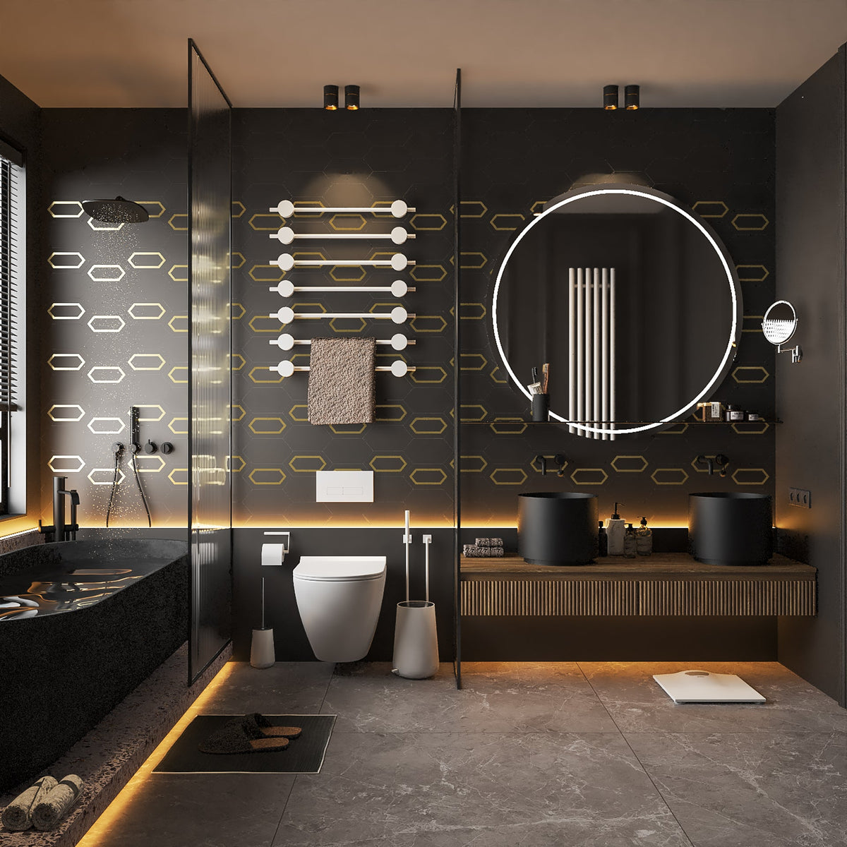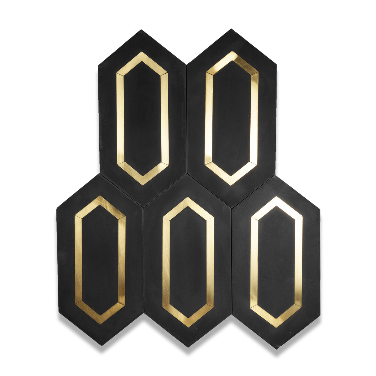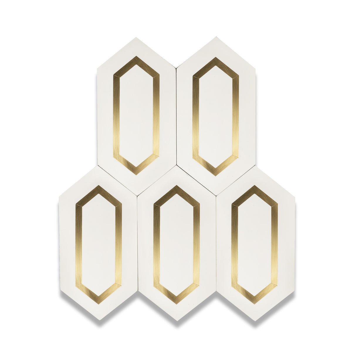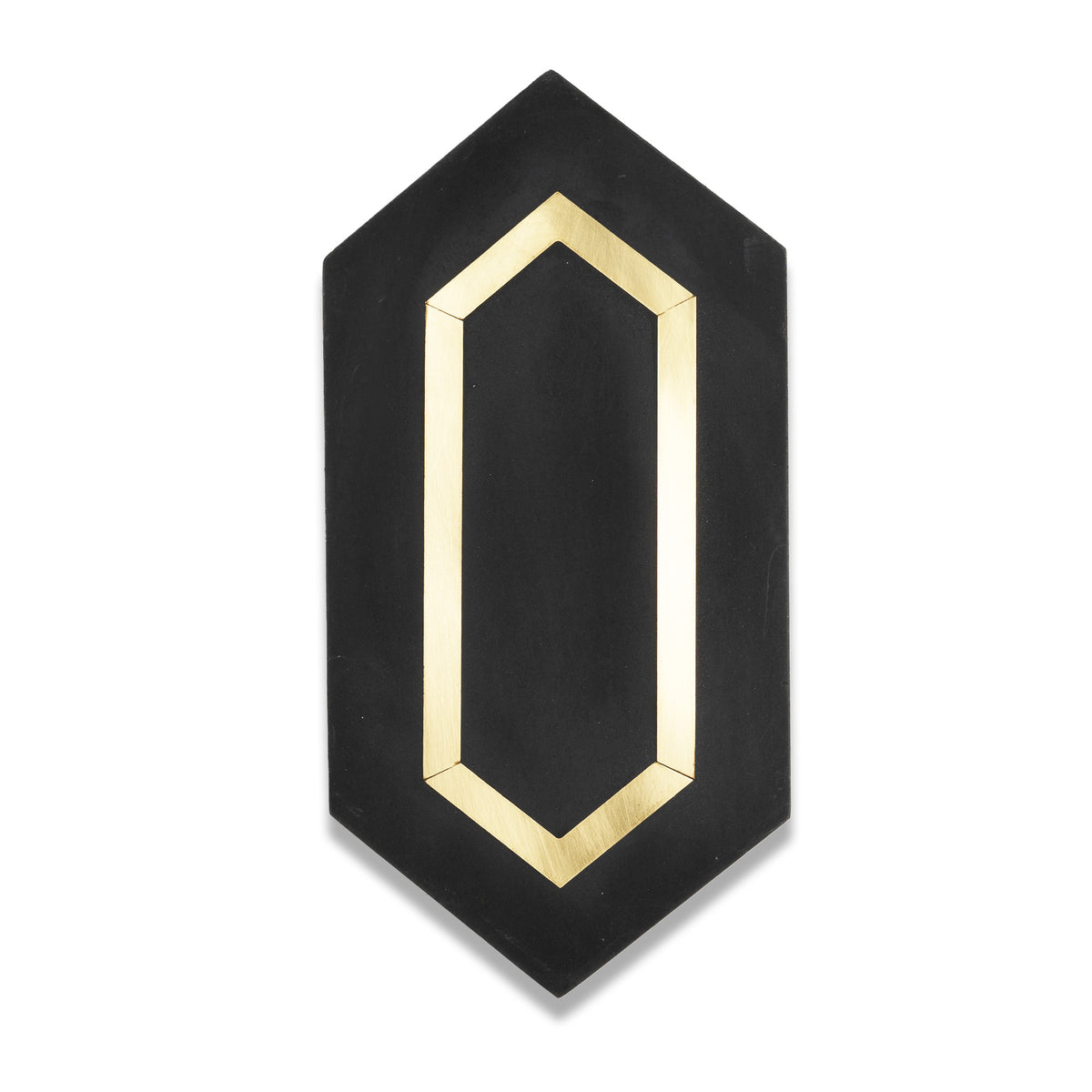 The Tiffany Brass Elite Tile takes the elongated and chic design of the original Tiffany cement tile and elevates it with a luxurious solid brass detail. Handcrafted from premium cement, this hexagon tile brings a touch of elegance and brilliance to any space. The Tiffany Brass Tile is perfect for creating a sophisticated and stylish look on walls, floors, or backsplashes.