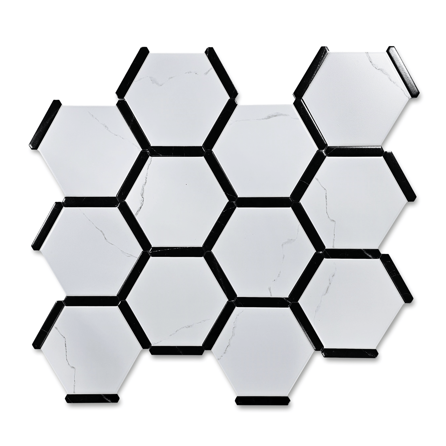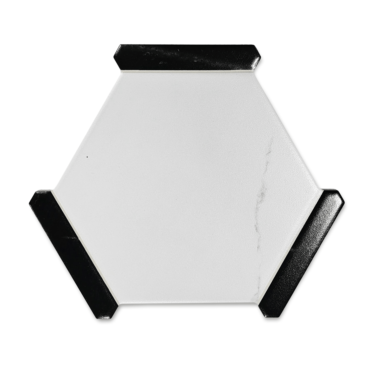 The Contour Collection redefines decorative tile with sculptural layouts and bold contrast built directly into the design. Each 9" x 10" porcelain tile in this hexagonal series is crafted to create the illusion of multi-piece inlays—without the complexity of assembling individual components. From clean monochrome borders to layered stone and wood combinations, our Contour tiles offer striking geometry with a single, easy-to-install surface.