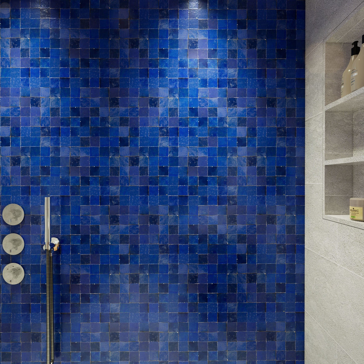 Dive into the captivating hues of our Berber Blue Zellige Tile in a 2x2 mosaic format. Handcrafted from authentic Moroccan clay, these Zellige tiles reflect the vibrant blues of endless skies and the rich heritage of Berber artistry. Their compact 2x2 size offers incredible versatility, perfect for intricate backsplashes, serene bathroom walls, or stunning accent features. Each tile carries its own unique variations in texture and tone, ensuring a look that feels both artisanal and timeless.