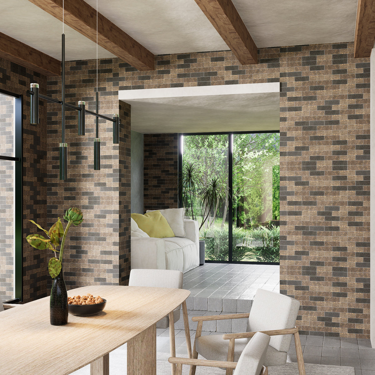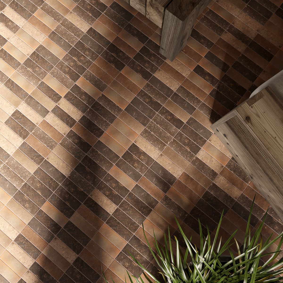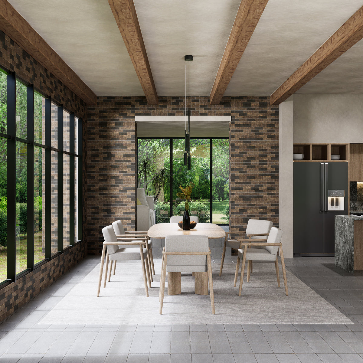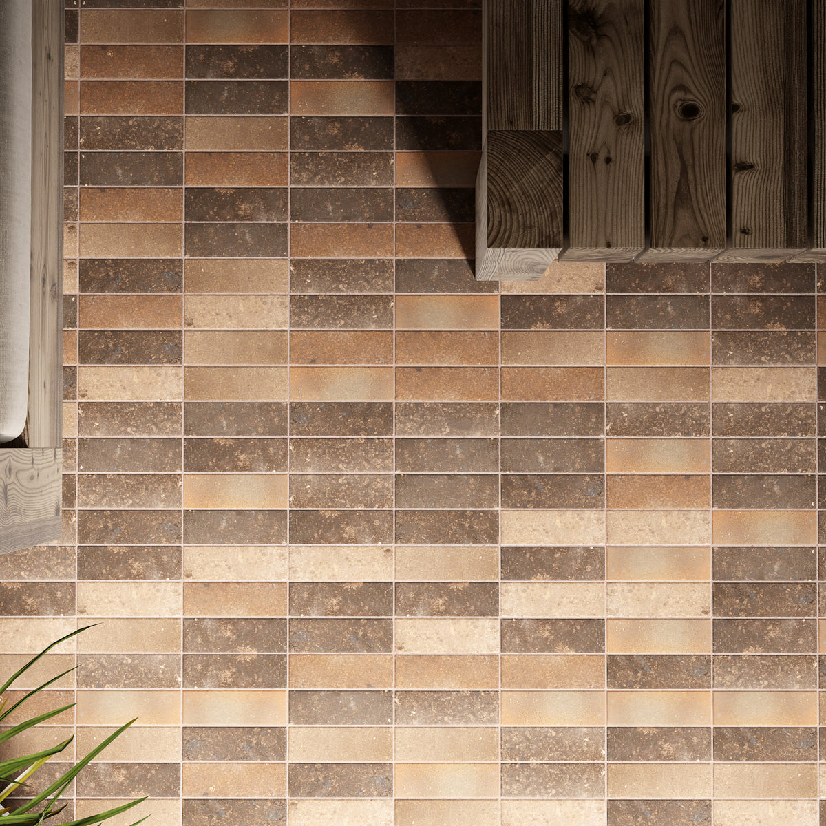color variations. Their elongated shape makes them ideal for creating stylish backsplashes, accent walls, and vertical applications, adding a sleek yet rustic element to any room. Each tile reflects the unpredictability of the wood oven baking process, making every installation a unique masterpiece.