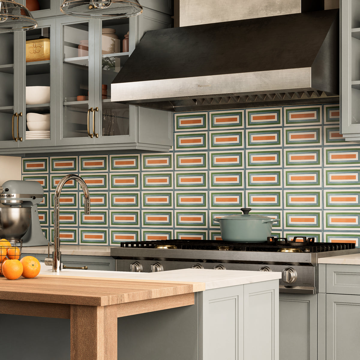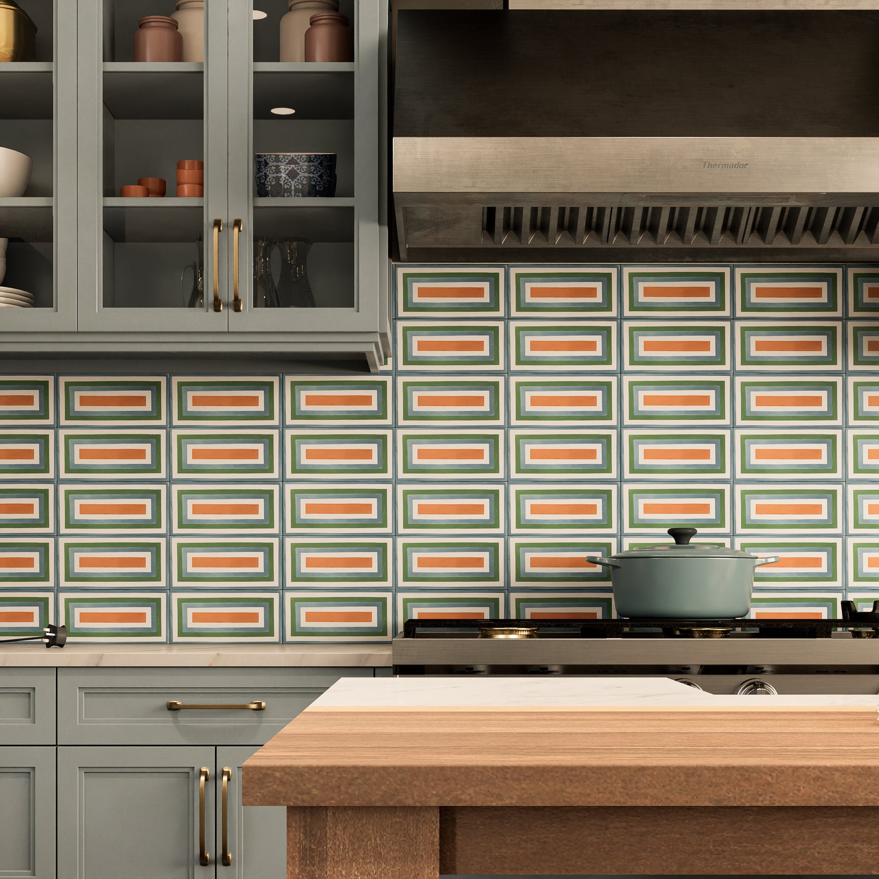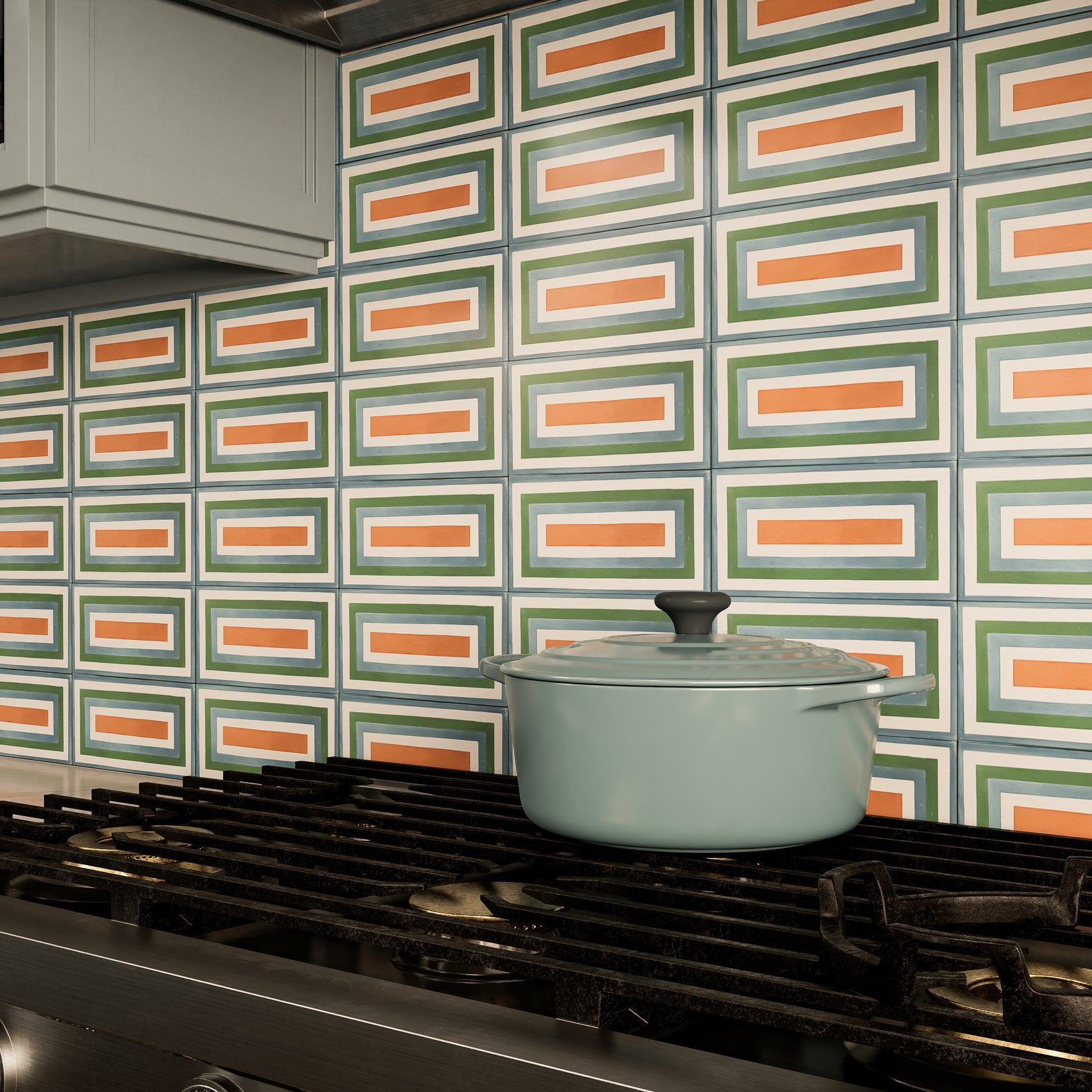 Frame tiles are premium cement tiles that explore balance through repetition, with parallel lines forming a frame-within-a-frame composition that creates a clean, architectural rhythm across the surface. Each variation shifts the atmosphere through color: Frames 4 pairs rich burgundy with soft white for sharp clarity, Frames 5 blends sky blue, leafy green, and terracotta orange in a playful, refreshing palette, Frames 6 deepens the same blue and green tones around terracotta for a more grounded, organic harmony, while Frames 7 sharpens the rhythm with bold cobalt blue, crisp white, and black for a striking, modern edge. Together, the series demonstrates how geometry stays constant while color transforms the mood.