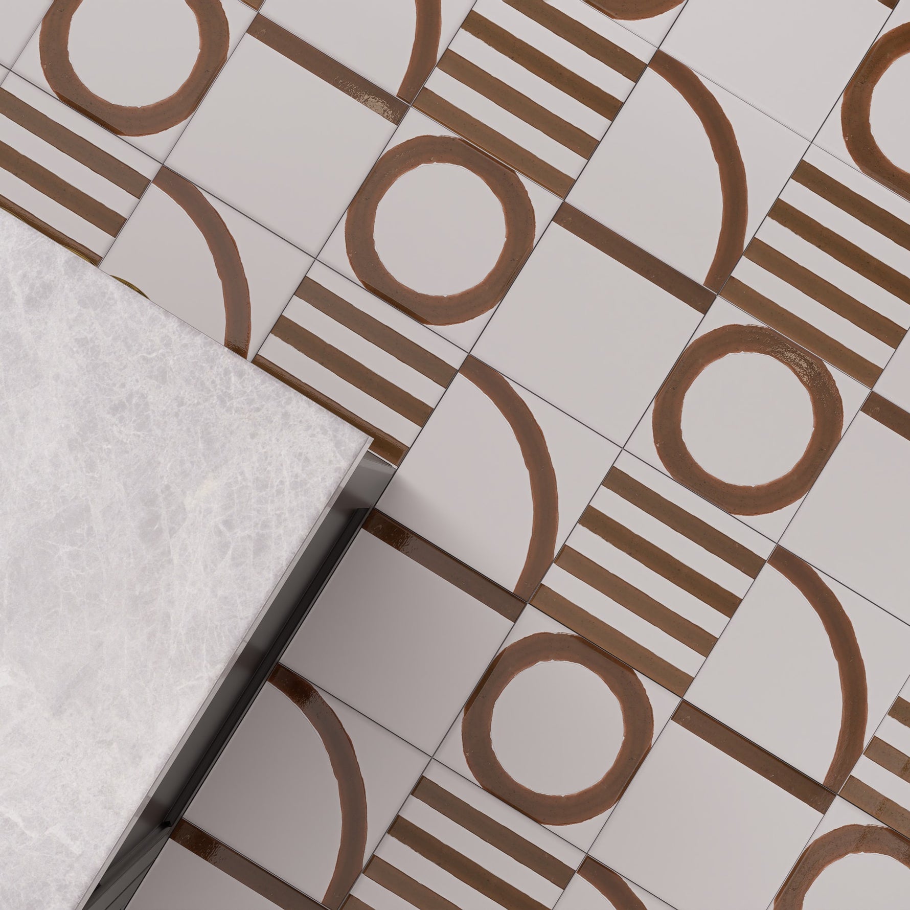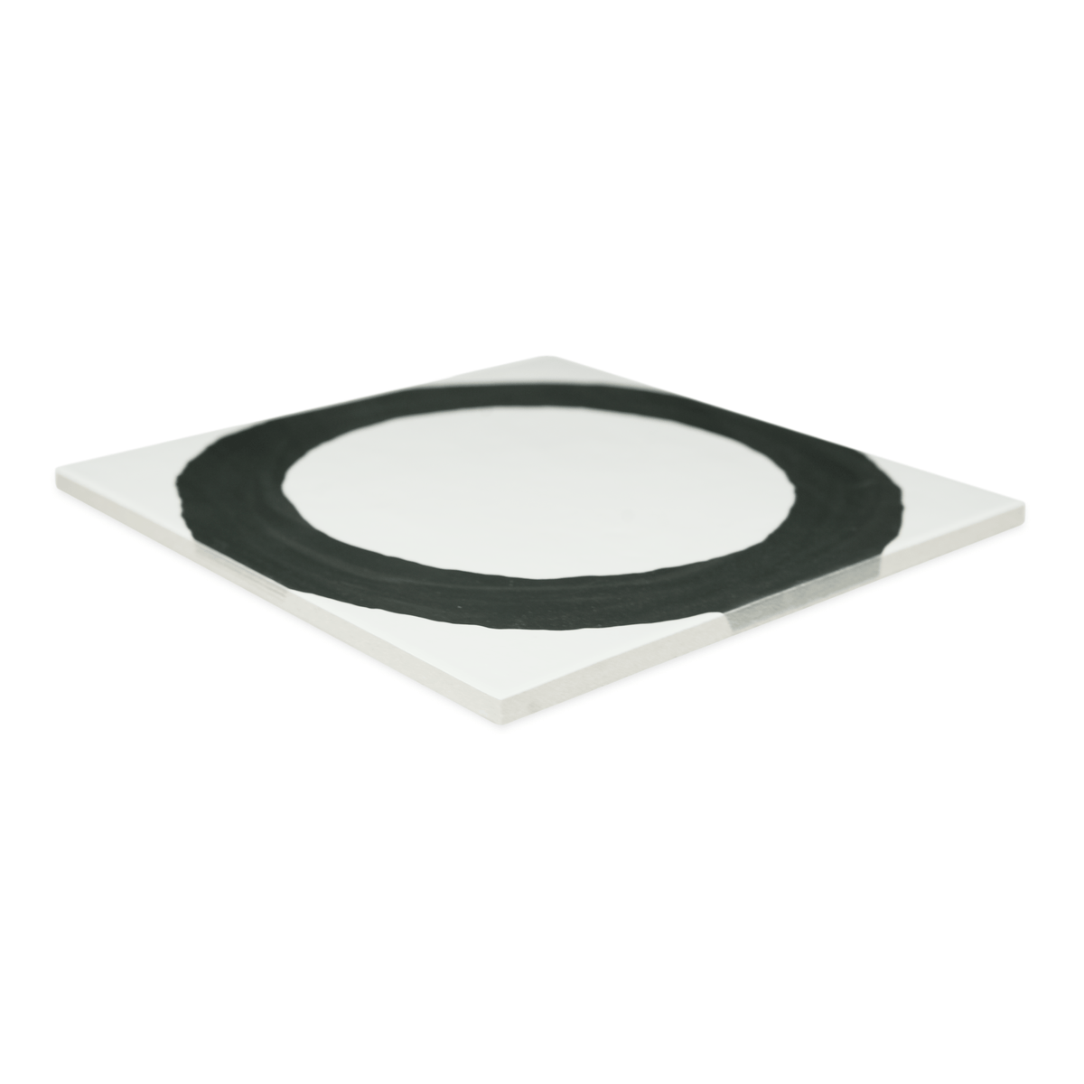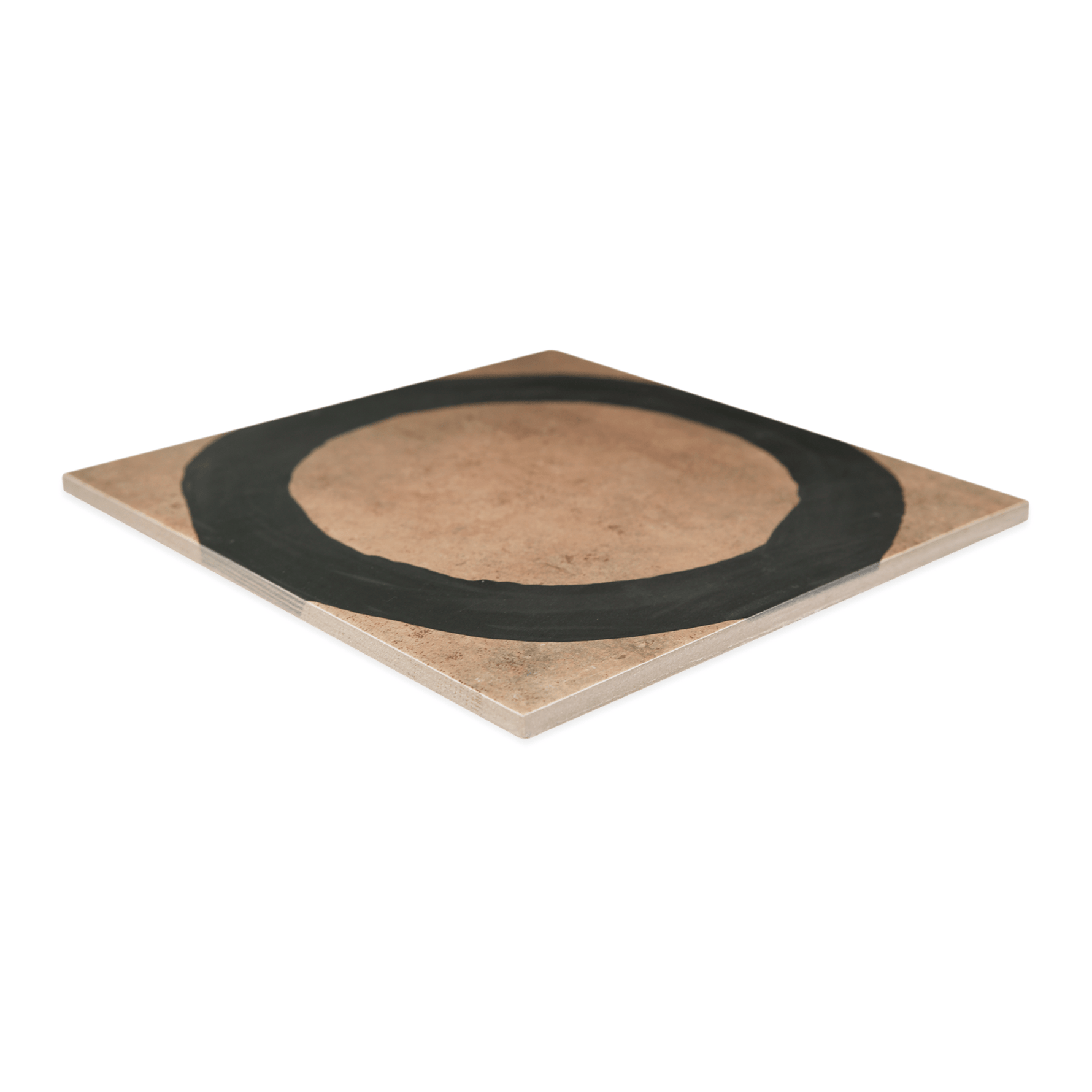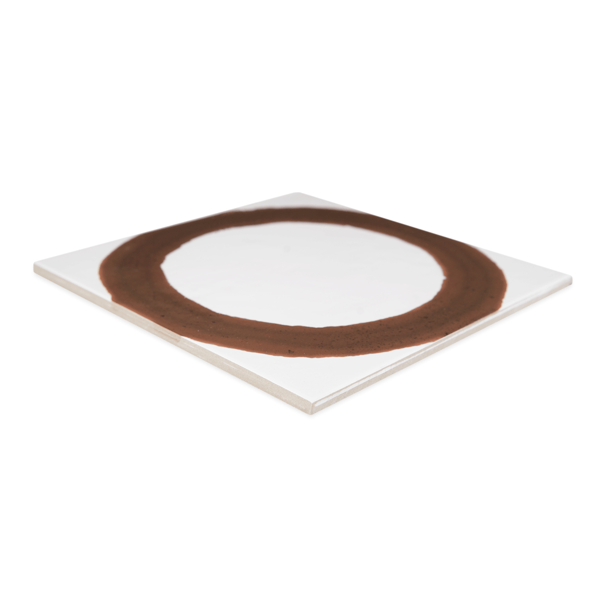 The Loop porcelain tile delivers a bold brushstroke of design with a hand-drawn circle rendered in shades of Ochre, Graphite, Ink, and Chalk. Set against a textured ceramic backdrop and sized at 8" x 8", this tile offers an artful take on geometric repetition with just enough irregularity to keep things feeling human.