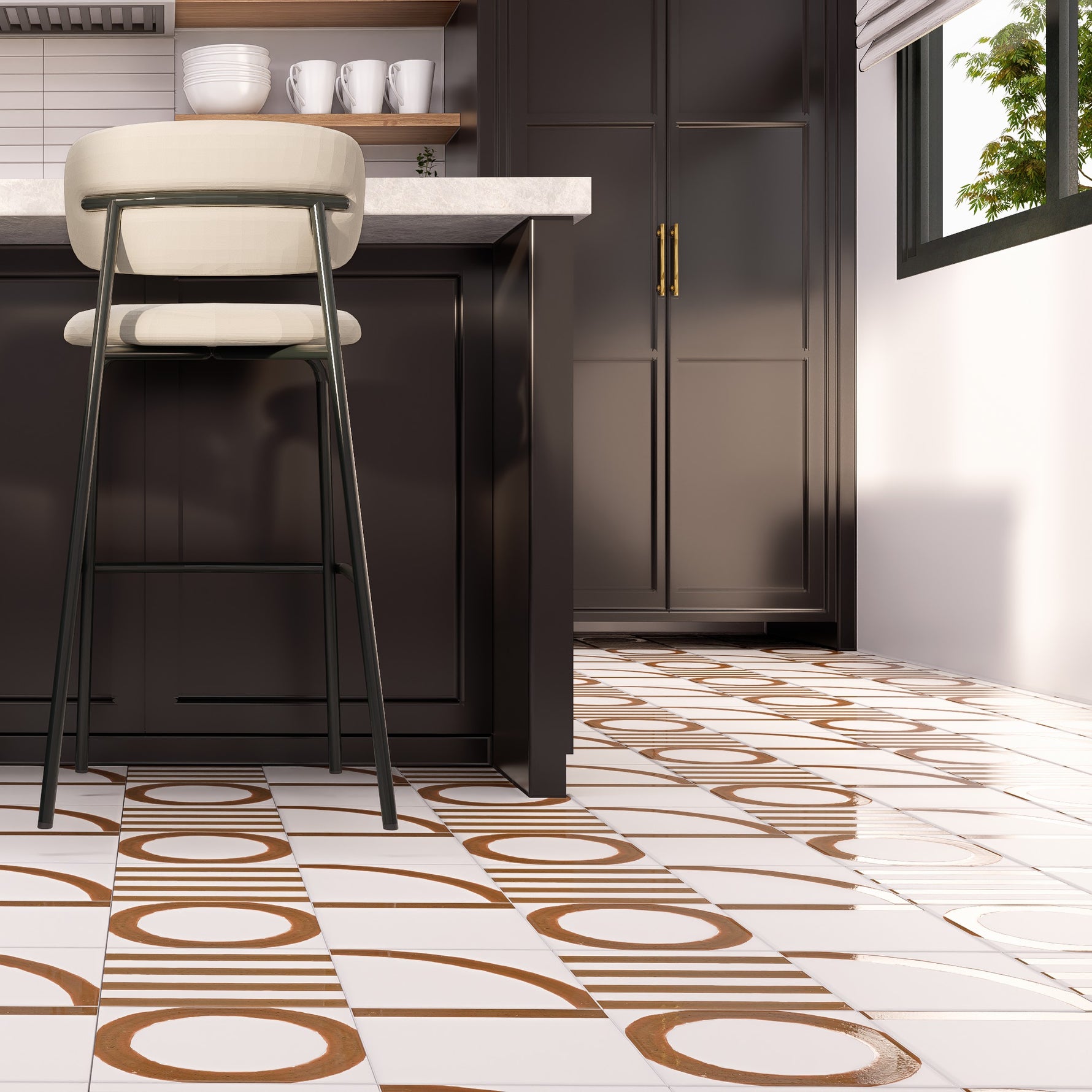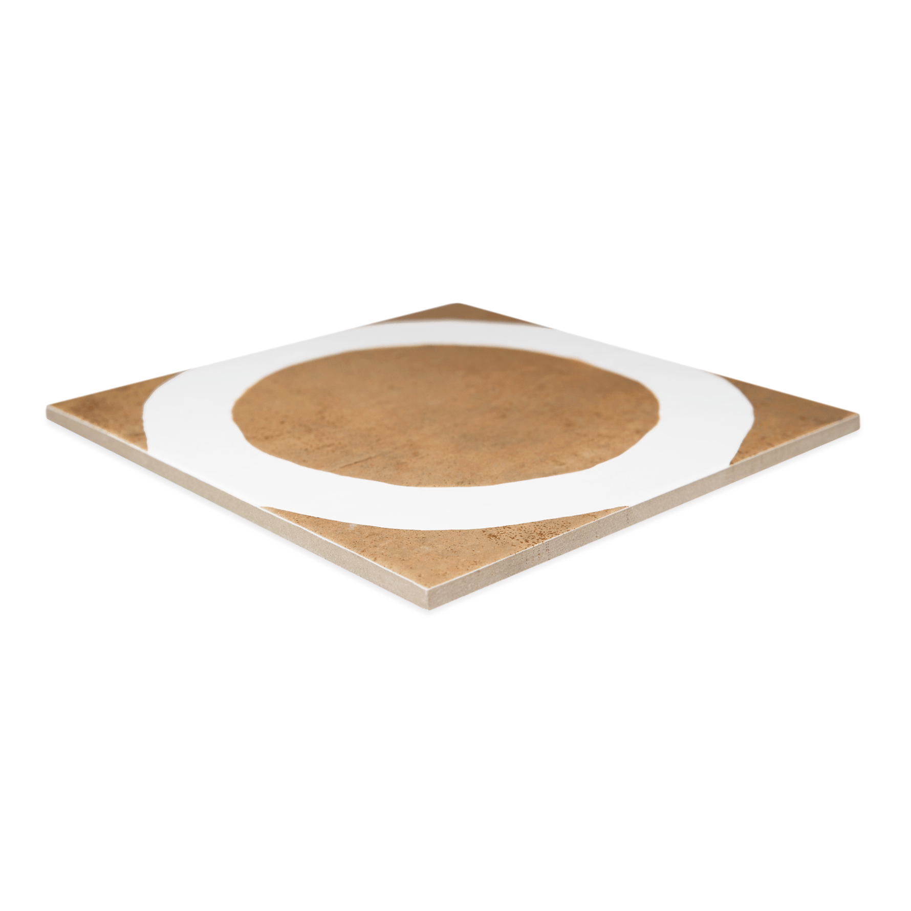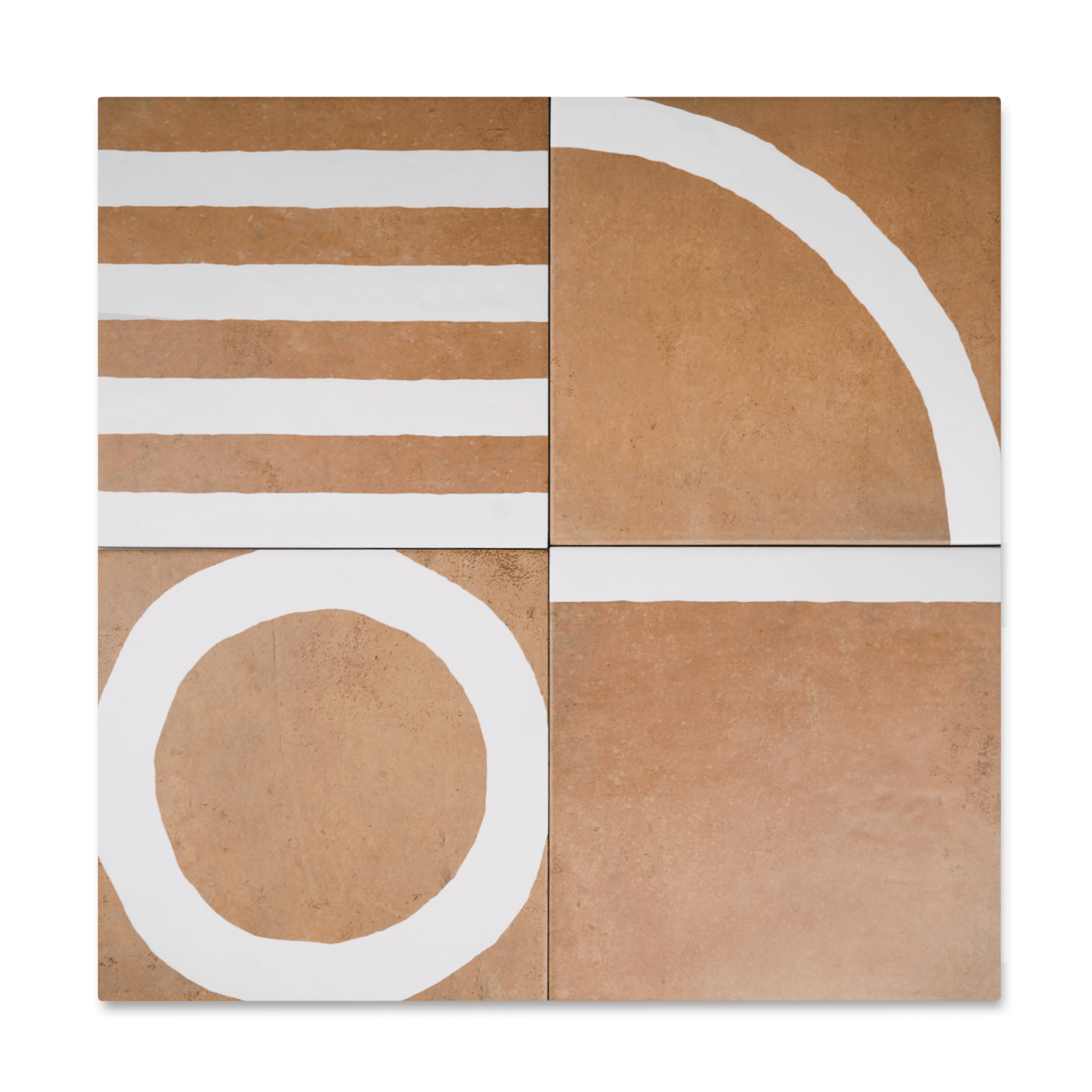 The Loop porcelain tile delivers a bold brushstroke of design with a hand-drawn circle rendered in shades of Ochre, Graphite, Ink, and Chalk. Set against a textured ceramic backdrop and sized at 8" x 8", this tile offers an artful take on geometric repetition with just enough irregularity to keep things feeling human.