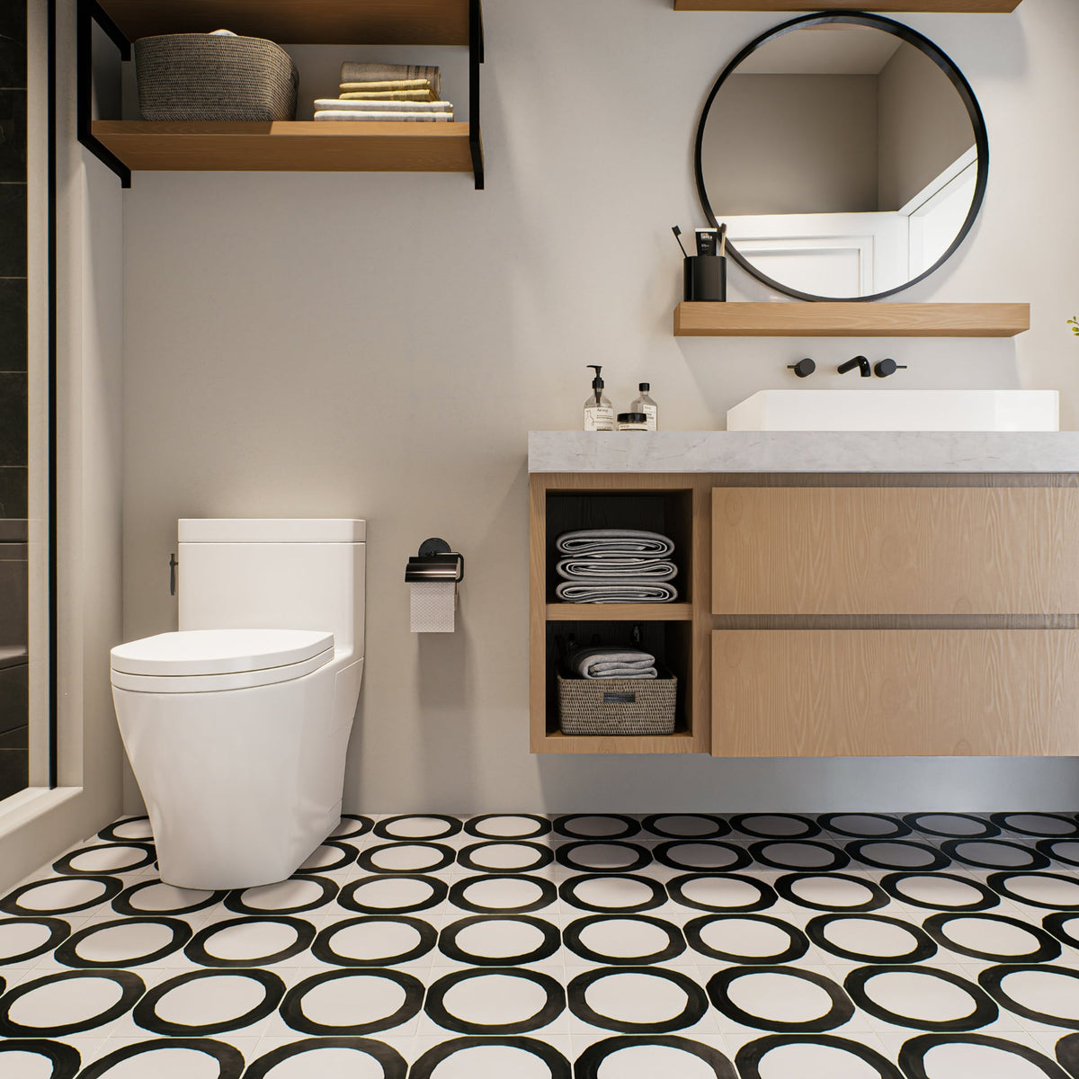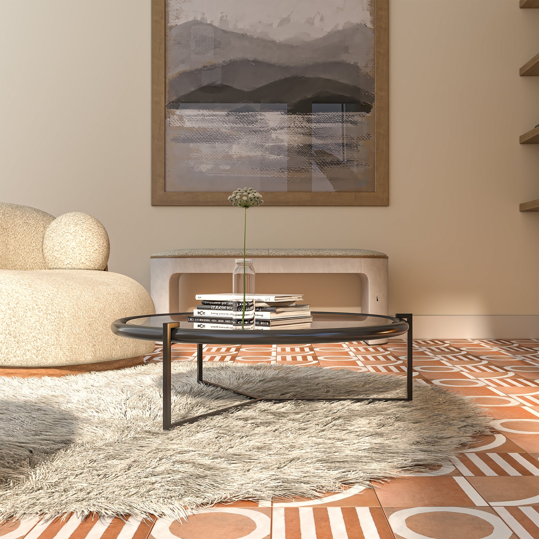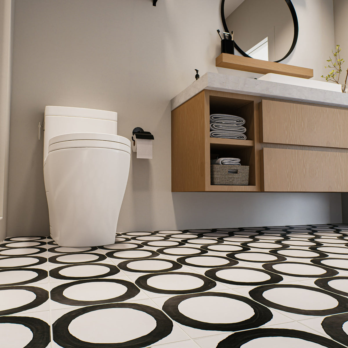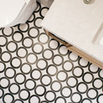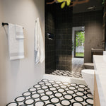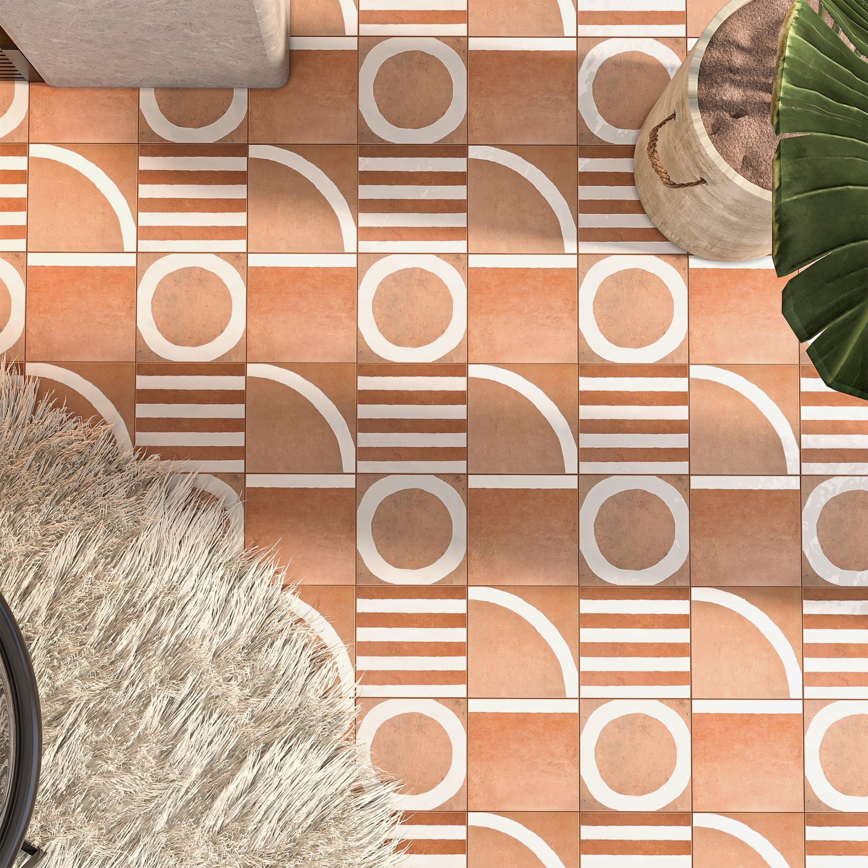 The Loop porcelain tile delivers a bold brushstroke of design with a hand-drawn circle rendered in shades of Ochre, Graphite, Ink, and Chalk. Set against a textured ceramic backdrop and sized at 8" x 8", this tile offers an artful take on geometric repetition with just enough irregularity to keep things feeling human.