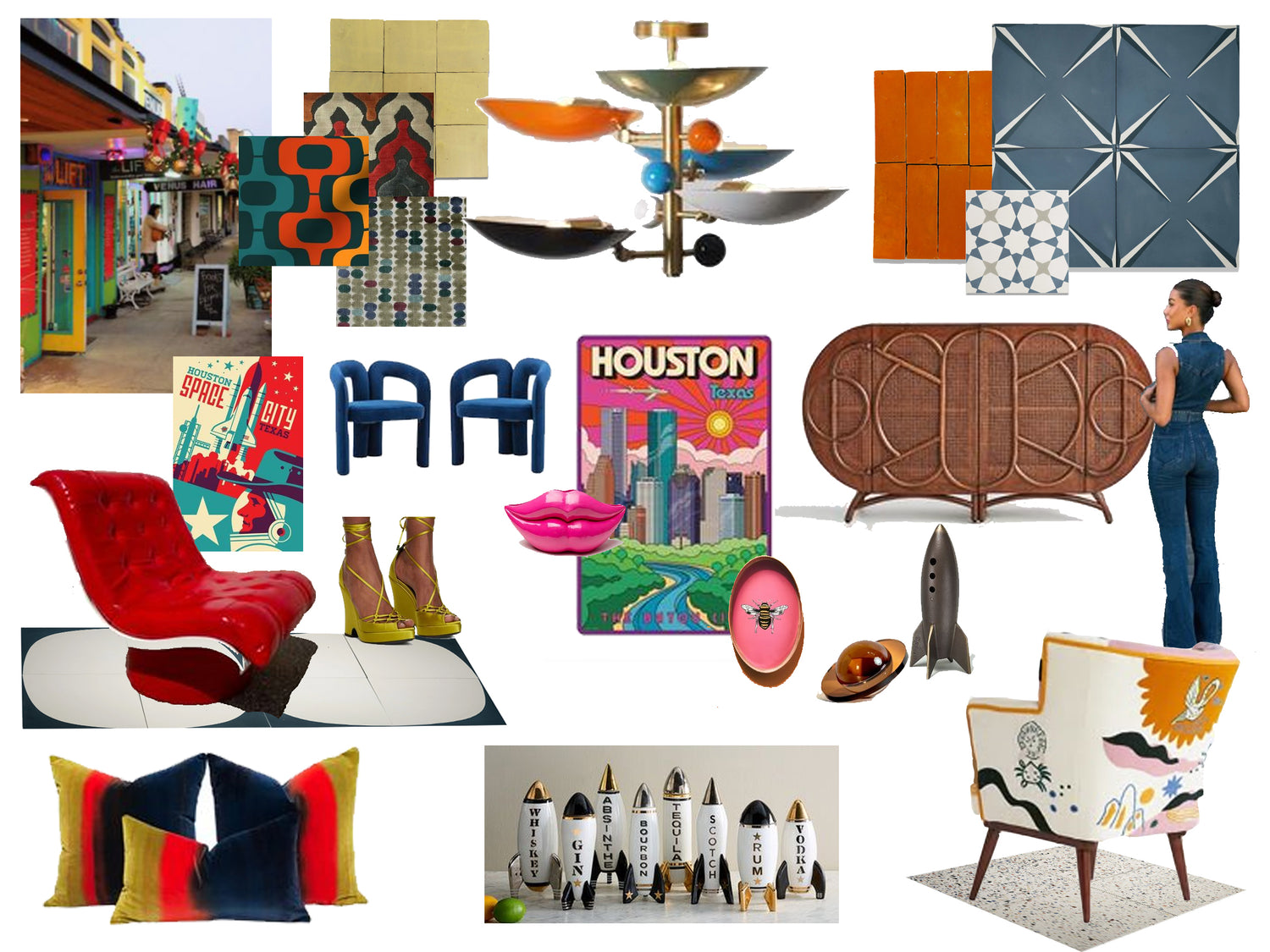 Houston is the neon glow of a late-night taqueria, the polished chrome of a vintage Cadillac, and the dust-kicked energy of a rodeo arena. This moodboard takes inspiration from Space City’s fearless mix of past and future: deep cosmic blues, fiery reds, golden mustard, and bold geometric patterns that nod to mid-century cool and frontier grit. It’s big, it’s bold, and it’s got that signature Houston swagger—because why blend in when you can launch into something legendary?