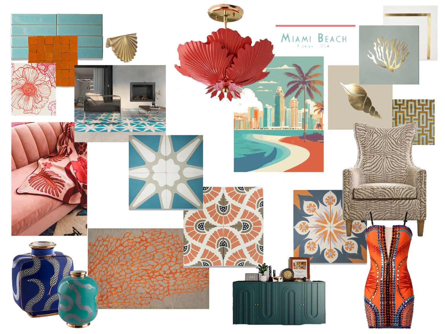 Miami, this mood board feels like a warm ocean breeze drifting through your home. It’s the cool turquoise of endless waves meeting the fiery coral of a sunset sky, the earthy terracotta of sun-drenched streets, and the shimmer of gold catching the last rays of daylight.