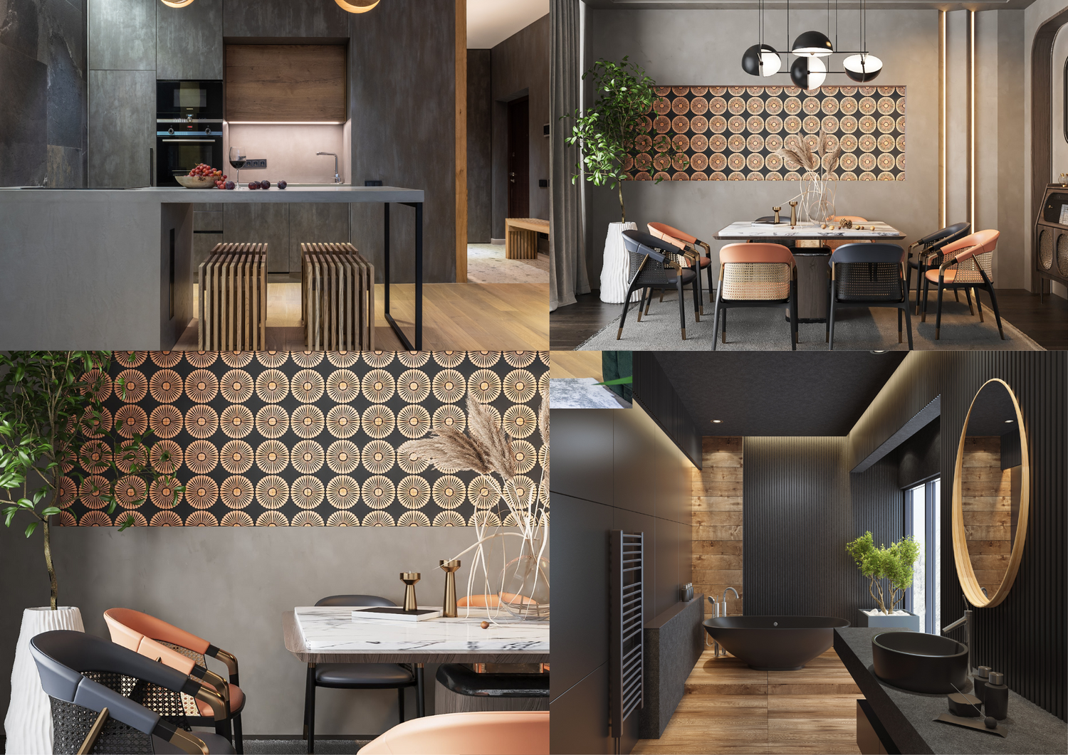 Its rich black backdrop and warm copper detailing create a dynamic, high-contrast look, perfect for accent walls, statement backsplashes, or luxe bathroom spaces. Whether you’re channeling Manhattan’s high-gloss glamour or Brooklyn’s industrial charm, Rita 6 adds depth, drama, and undeniable style. Because in New York, making an impression is everything.