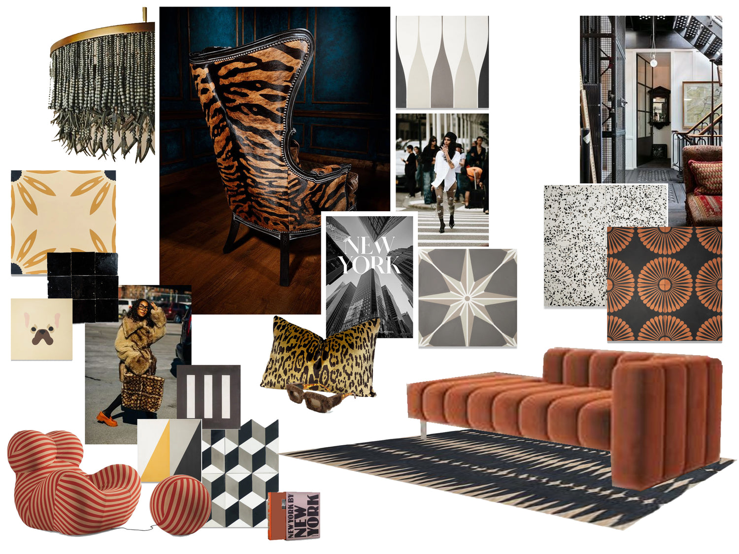 This mood board is the city in a snapshot—gritty, glamorous, and unapologetically bold. It’s the high contrast of black and gold, the structured geometry of Art Deco, and the rebellious energy of animal prints. Like a walk through SoHo or a penthouse in Tribeca, this aesthetic balances luxury with edge, vintage charm with modern cool.
