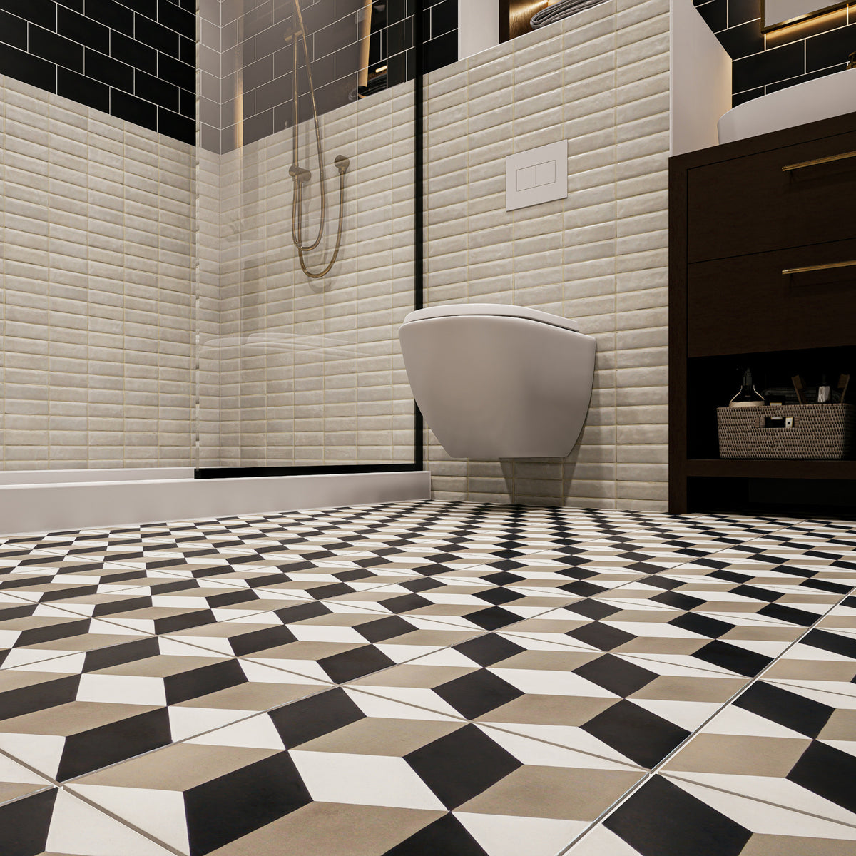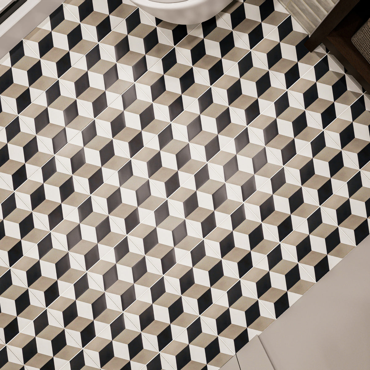 The Dama Cement Tile features a bold, geometric pattern that brings a touch of cubism to any space. Handcrafted from premium cement, this 8” x 8” tile offers a sleek, monochromatic take on a classic encaustic design. Perfect for walls, floors, or backsplashes, the Dama Tile adds structure and modern sophistication to both residential and commercial interiors.