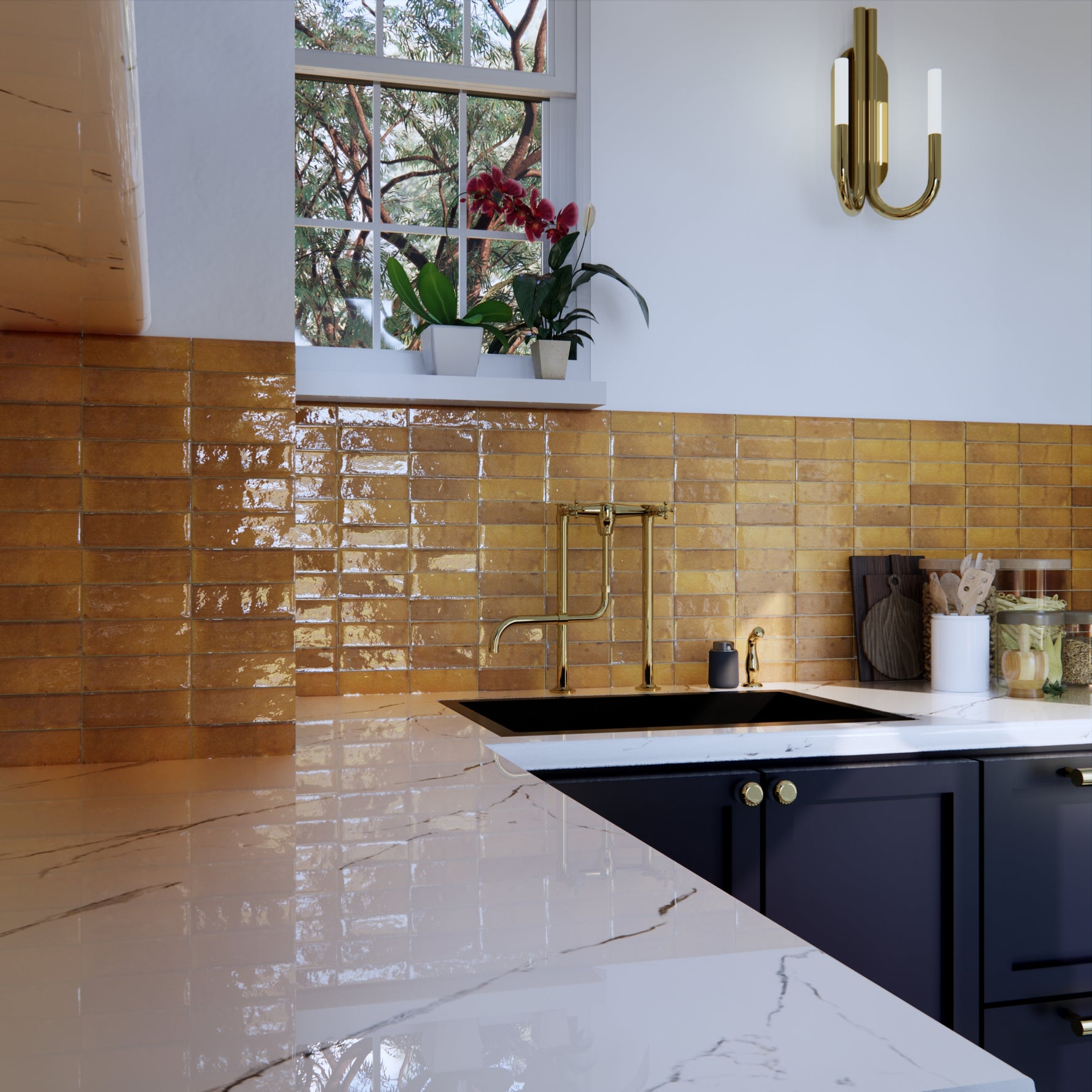 Invite the desert's warmth into your home with the Kasbah Camel Zellige Tile in a 2x6 Bejmat size. Handcrafted from natural Moroccan clay, these elongated tiles reflect the deep golden tones of a camel's coat under the Saharan sun, adding a touch of exotic charm to your space.
