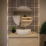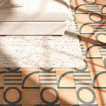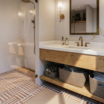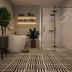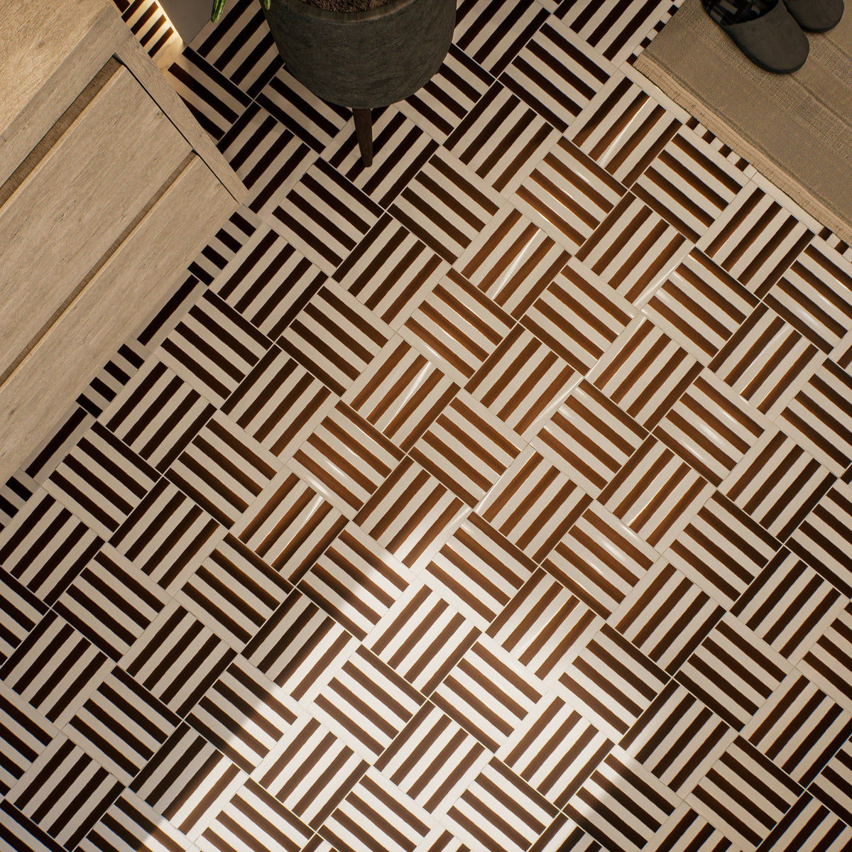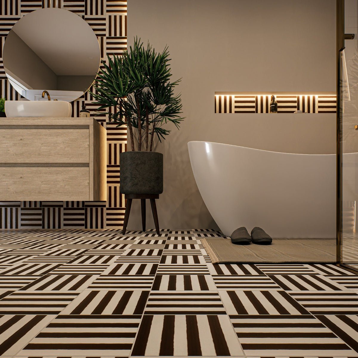 The Lines porcelain tile features vertical stripes in tones of Ochre, Graphite, Ink, and Chalk - a composition that brings rhythm, precision, and play into one impactful square. Measuring 8" x 8", this tile evokes the look of ink-drawn lines, slightly irregular in width to emphasize its hand-finished look.